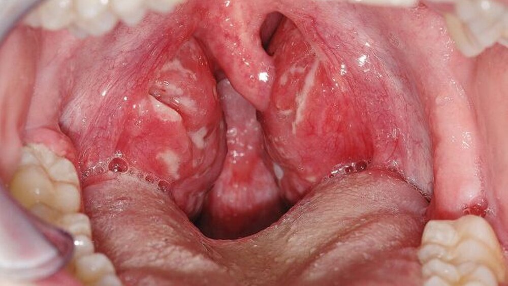 Bei bis zu 10 Prozent der Patienten ist die Ursache der Halitosis nicht in der Mundhöhle zu suchen, sondern Ausdruck einer systemischen Erkrankung. Die ursächlich beteiligten anatomischen Strukturen sind dabei vor allem die oberen Atemwege mit Nase / Nasennebenhöhlen und Pharynx, die unteren Atemwege mit Larynx, Trachea und Bronchien sowie der Gastrointestinaltrakt [Porter & Scully 2006, Scully & Greenman 2008]. Der Geruch ist in diesen Fällen sowohl über den Mund als auch über die Nase messbar. Im Hals-Nasen-Ohren-Bereich kommt es besonders bei Infektionen der oberen Atemwege zur Ausbildung einer Halitosis. Bei Erwachsenen wird die Tonsillitis als häufigste Ursache des Mundgeruchs angesehen (Abbildung 7), besonders auch bei Ausbildung von Tonsillolithen [Scully & Greenman 2008]. Bei Kindern wiederum sind vor allem in die Nase verlagerte / gesteckte Fremdkörper häufig Ursache einer Halitosis. Eine chronische Sinusitis – rhinogen oder dentogen bedingt, teils auch über anatomische Besonderheiten wie eine Septumdeviation begünstigt- oder auch Rhinitis können ebenso Ursache einer Halitosis sein. Diagnostisch kann bei Patienten mit chronischer Sinusitis oder Rhinitis auch ein sogenanntes postnasal drip vorhanden sein, das heißt ein dorsaler Sekretabfluss von der Nase auf den Zungengrund, wodurch das Wachstum von Bakterien begünstigt werden kann [Lambrecht 2006].