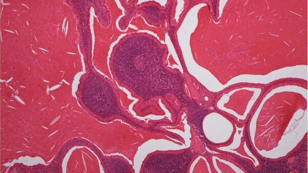 Die meist gut umschriebenen ovalen Warthin-Tumore, aus denen häufig eine klare bis bräunliche Flüssigkeit austritt, zeichnen sich histopathologisch durch eine dünne Kapsel und im Inneren durch Faltelungen mit zystischen Hohlräume aus, die von einer zweilagigen Schicht onkozytärer Epithelien ausgekleidet sind. Das Stroma enthält reichlich polyklonal, lymphatisches Gewebe mit Keimzentrumsbildung.