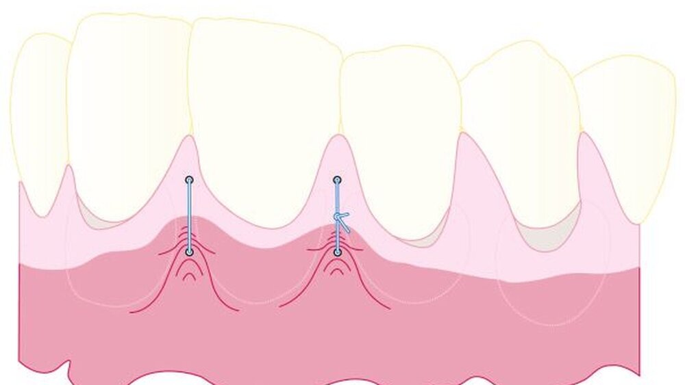 In 28 Fällen wurde bei der Taschenpräparation die Interdentalpapille durchtrennt. In diesen Fällen wurde der Nahtverschluss nach Bruno oder Zuchelli durchgeführt.