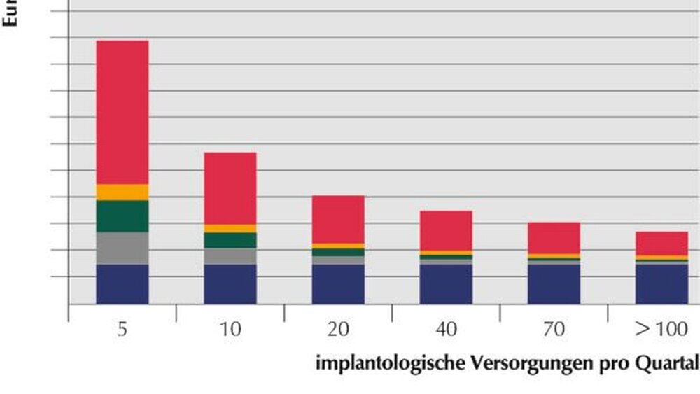 Bei Zahnärzten, die weniger als zehn Implantate im Quartal setzen, fallen die Einnahmen aus diesem Bereich gering aus (Abbildung 5). Die Kosten für Ausbildung, Marketing und andere Investitionen verteilen sich hier auf wenige Behandlungen und sind dementsprechend hoch. Nimmt die Zahl der Versorgungen nicht zu, bleibt der Ergebnisbeitrag des Behandlungsbereichs Implantologie unter dem Durchschnitt anderer Behandlungen und verschlechtert das Gesamtergebnis der Praxis (Abbildung 6).