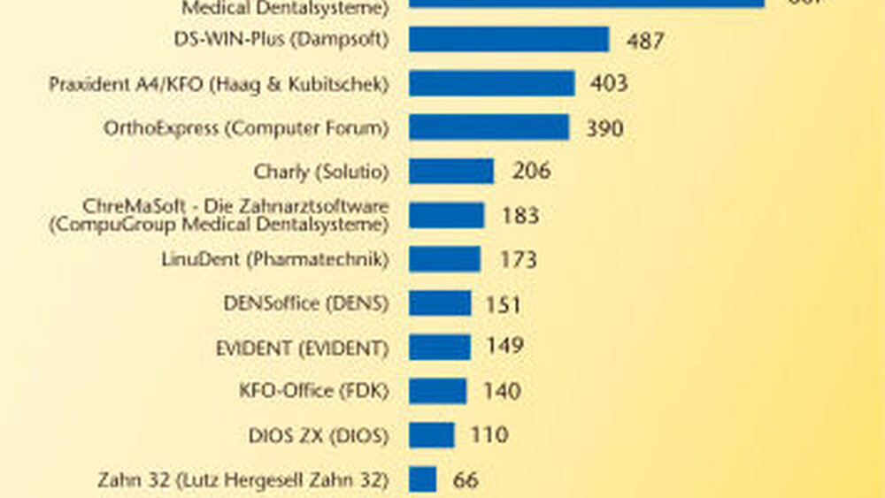 Nach KZV-Bereichen aufgegliederte Übersichten über die Software-Hersteller, eine TOP-10 über die KCH-Abrechnungen per Datenträgeraustausch und eine KFO-TOP-5 gibt es bei der KZBV (S.Bonin@KZBV.de).