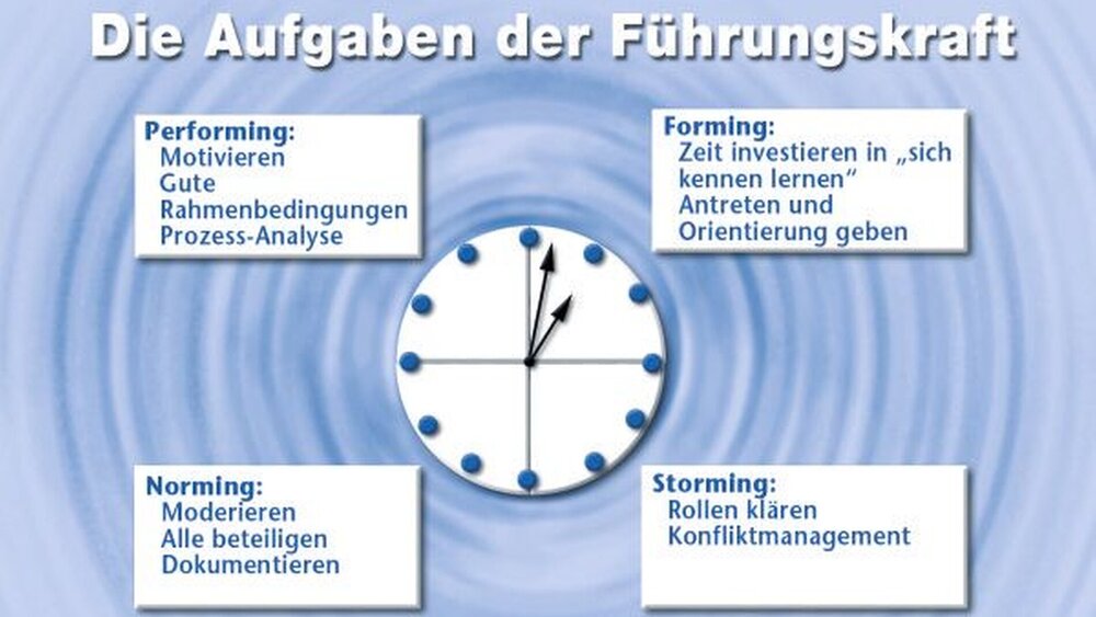 Der Erziehungswissenschaftler Bruce W. Tuckman beschrieb 1965 die Teamentwicklung in einem Vier-/Fünf-Phasenmodell. Dabei ist die Uhr Plattform für die Darstellung der Teamentwicklungsstufen.