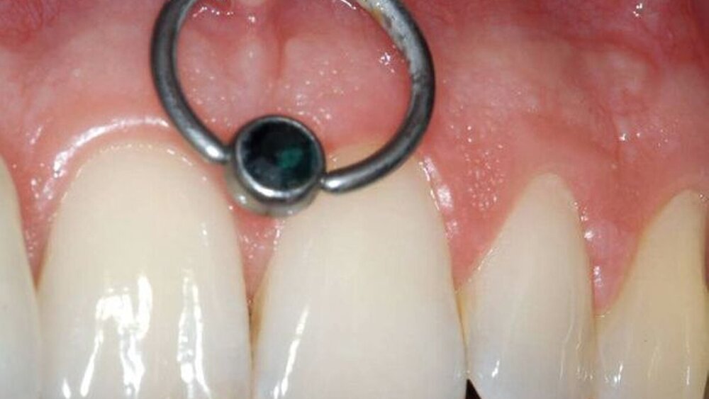 Aber auch Komplikationen während des Tragens, nach der Einheilungsphase, sind häufig. Sie entstehen zum einen durch Materialunverträglichkeiten und/oder mangelnde Mundhygiene, zum anderen durch die Form und die Lokalisation des Piercings. Anzuführen sind hier Erkrankungen des Zahnhalteapparats, wie Rezessionen der Gingiva und Zahnlockerungen [Özkavak et al., 2000; O’Dwyer et al., 2002; Zadik et al., 2007] sowie Schäden an der Zahnhartsubstanz (Abrasionen, Schmelzsprünge) und an den Restaurationen [Brennan, 2006].