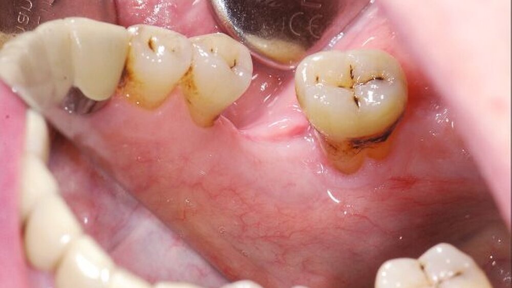 Ein 81-jähriger Patient wurde der Klinik aufgrund eines Ulkus im Molarenbereich des linken Unterkiefers vorgestellt. Klinisch zeigte sich hier eine spontane, schmerzlose Knochenexposition von Regio 36 bis nach retromolar. Der parodontal geschädigte Zahn 37 lag im Zentrum der Läsion (Ab- bildung 1). Die klinische Morphologie war nicht richtungsweisend, insbesondere fanden sich keine umgebenden Vorläufer- läsionen, kein Randwall und keine pathologischen Gefäßektasien als typische Stigmata einer malignen Läsion, aber auch keine Hinweise auf eine traumatisch-irritative oder infektiöse Ursache. Sowohl 37 als auch die Prämolaren des linken Unterkiefers reagierten auf Kälte-Provokation sensibel.