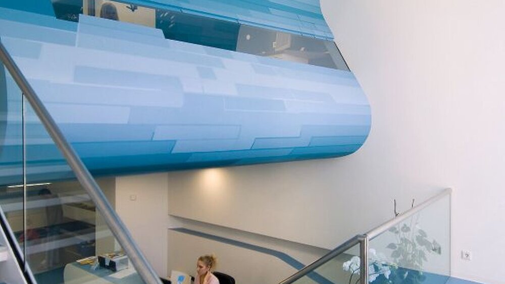 Über eine kleine Treppe nach unten gelangen die kleinen Patienten und ihre Eltern in den organisch geschwungenen, in den Farben weiß und blau gestalteten Empfangsbereich der Praxis. Hier wie in den übrigen Räumen treffen die kleinen Patienten auf ein maritimes Ambiente mit blauen Wänden und Abbildungen von Fisch-Schwärmen. „Wenn die Kinder das erste Mal in eine Zahnarztpraxis kommen, dann treten sie in eine für sie fremde Welt ein“, so Ali Mokabberi. „Das löst Spannung und Neugier aus. Bei uns ist es fast immer so, dass das Erlebnis der Wasserwelt mit seinen Wellen und Fischen die Zahntechnik überlagert und die Kinder schnell vergessen lässt, dass sie eigentlich beim Zahnarzt sind. Und das ist dann die beste Voraussetzung für die bevorstehende Behandlung.“