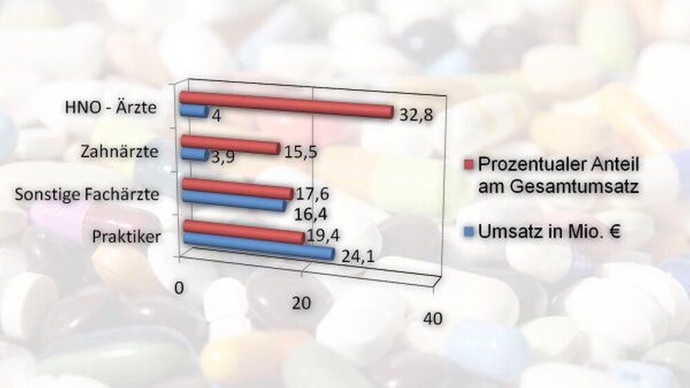 Schließlich wurden noch die Gesamtumsätze (in Millionen Euro) sowie der jeweilige Anteil am Antibiotikagesamtmarkt (in Prozent) für die einzelnen Fachgruppen dargestellt.