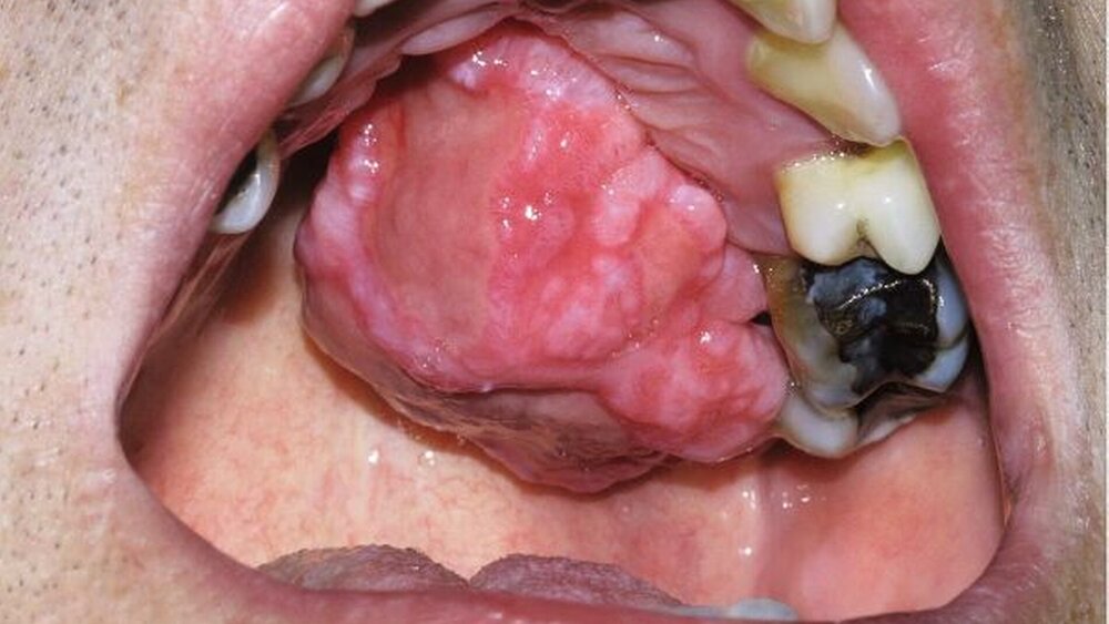 Ein 76-jähriger Patient wurde uns zur weiteren Abklärung eines ausgedehnten Tumors im linken Unterkiefervestibulum zugewiesen. Bei der Erstuntersuchung war er in gutem Allgemeinzustand. An Allgemeinerkrankungen lag eine medikamentös behandelte arterielle Hypertonie vor.