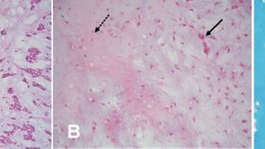 Über einen präaurikulären Zugang ließ sich die bekapselte Raumforderung gut aus dem umliegenden Gewebe entfernen (Abbildung 4A). Der Anschnitt zeigte eine grau glänzende, teils zystische Struktur (Abbildung 4B). Die histopathologische Aufarbeitung des Präparats (Abbildung 5) bestätigte die Verdachtsdiagnose eines pleomorphen Adenoms.