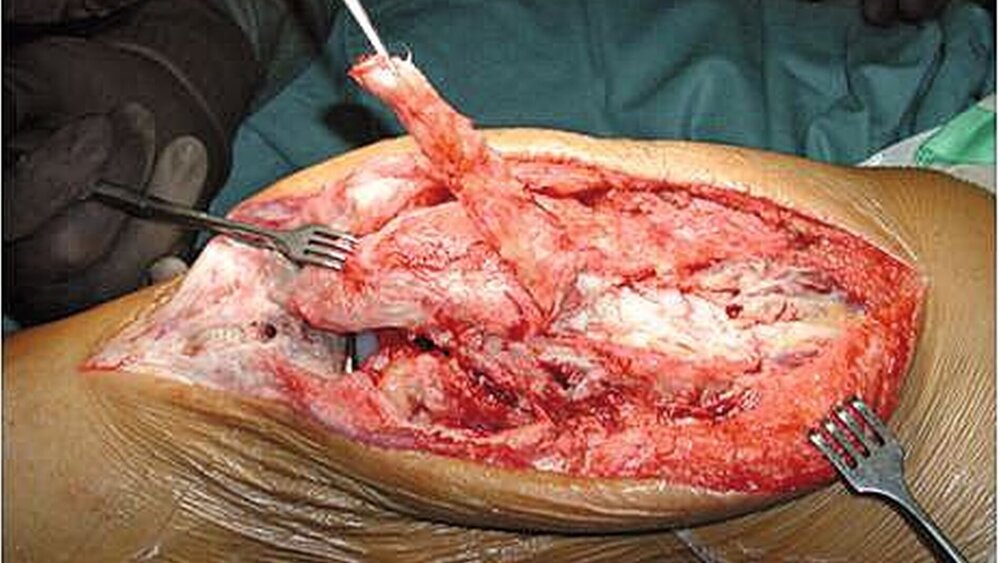 Partialrupturen ohne Kontinuitätsunterbrechung der Hauptportion der Quadrizepssehne oder der Patellarsehne können konservativ/funktionell mittels Orthesen behandelt werden. Es muss eine Teilbelastung für sechs Wochen eingehalten werden, maximale Beugung sollte vermieden werden. Bei höhergradigen Partial- oder kompletten Rupturen besteht die Indikation zur Operation. Welches Verfahren angewandt wird, hängt im Wesentlichen von der Ausbildung des Chirurgen ab [2, 5, 8]. Voraussetzung für die Sehnenheilung ist sowohl eine stabile Sehnennaht als auch eine frühfunktionelle Nachbehandlung. Wenige Tage nach dem Trauma beginnt sich die Sehne bereits zu retrahieren. Ein Zeitrahmen von drei bis 14 Tagen bis zur operativen Rekonstruktion wird noch als günstig angegeben. Doch auch Patienten mit älteren Rupturen profitieren aufgrund der schlechten Ergebnisse konservativer Therapie von rekonstruktiven Verfahren. Verzögerungen der operativen Versorgung über die Primärphase hinweg führen bei ausgeprägten kompletten Rupturen zu einer Retraktion der Sehne nach proximal, welche dann aufwendige rekonstruktive Maßnahmen erforderlich macht. Bei der Operation sollte regelhaft eine Gewebeprobe zur histologischen Untersuchung entnommen werden, um degenerative Schädigungen nachzuweisen. Liegt ein Sehnendefekt vor, oder lässt sich keine Readaptation des Sehnenstumpfes an die Patella erzielen, muss eine lokale Sehnenplastik erfolgen (Abbildung 5) [5]. Als Nahtmaterial sollten bevorzugt monofile, spät resorbierbare Fäden verwendet werden. Zur Augmentation kann ebenfalls Nahtmaterial (wie Fiberwire) Verwendung finden oder Drahtcerclagen. Letztere erfordern jedoch eine spätere Implantatentfernung [1, 4 bis 6].