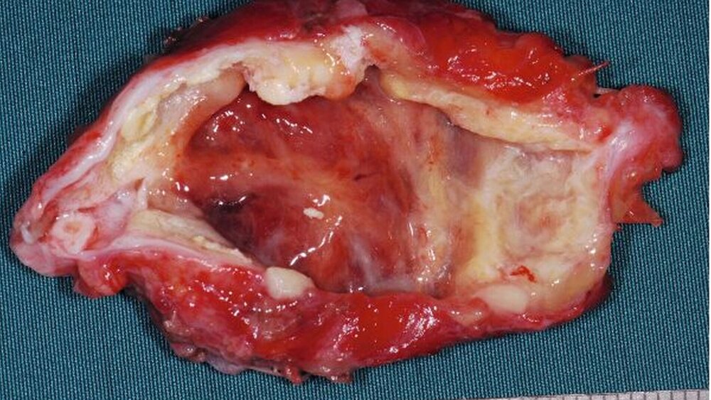 Die Läsion, die sich intraoperativ gut abgegrenzt von der Speicheldrüse darstellte, wurde über einen submandibulären Zugang in toto entfernt, wobei ein weit nach dorsal cranial reichender Ausläufer bis an das Mastoid verfolgt werden musste. Im Anschnitt des prall-zystischen Gebildes entleerte sich ein zäher, talgartiger Inhalt, der im Gegensatz zum meist flüssigen Sekret einer Halszyste typisch für den Inhalt einer Dermoidzyste war (Abbildung 3). Die histologische Untersuchung (Abbildung 4) bestätigte nachfolgend die Diagnose einer Dermoidzyste mit dem pathognomonischen Aufbau der Zystenwandung, die neben einem mehrschichtigen, verhornenden Plattenepithel auch die typischen Hautanhangsgebilde aufwies.