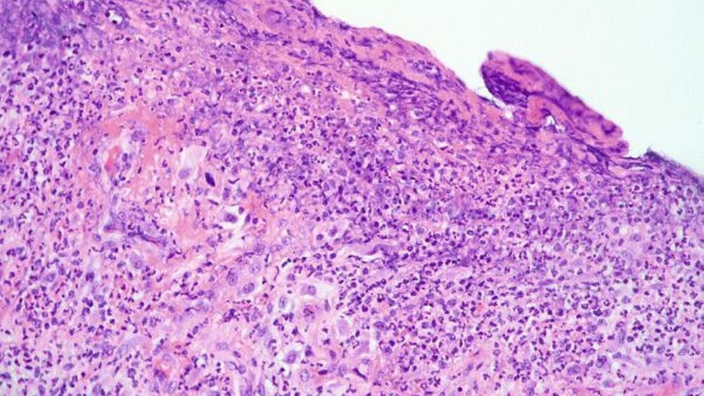Die histopathologische Untersuchung ergab eine Zyste mit mehrschichtigem, nicht verhornendem Plattenepithel sowie fibrosiertes Bindegewebe mit deutlicher lymphozytärer Infiltration (Abbildungen 5 a und b), passend zum klinischen Bild einer entzündlich überlagerten, radikulären Zyste.