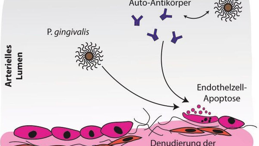 Zur Erklärung der beobachteten Assoziation von parodontalen Infektionen und Atherosklerose wurden diverse potenzielle Pathomechanismen beschrieben, die direkt oder indirekt die Effekte der Infektion bei der Entstehung und Progression der Atherosklerose als auch die beobachteten systemischen Effekte einer Parodontaltherapie vermitteln könnten [ausführliche Übersicht bei Kebschull et al., 2010]. Nach heutigem Kenntnisstand ist die Grundlage einer kausalen Verbindung von parodontalen Infektionen und Atherosklerose der Eintritt von oralen Bakterien, ihren Bestandteilen oder durch die Parodontitis freigesetzten Entzündungsmediatoren über das ulzerierte Taschenepithel des Parodontiums in den Blutkreislauf. Bakteriämien werden von alltäglichen oralen Aktivitäten wie Zähneputzen oder Kauen ausgelöst, also keineswegs nur durch Zahnbehandlungen. Ihre Häufigkeit und Ausprägung korreliert mit dem Schweregrad der parodontalen Infektion. Die parodontalpathogenen Bakterien gelangen über den Blutkreislauf auch in die Herzkranzgefäße und konnten in einer Vielzahl von Studien in atherosklerotischen Plaques nachgewiesen werden. Dort vermitteln sie über verschiedene Signalwege eine verstärkte Atherogenese. Die wichtigsten Pathomechanismen werden in den schematischen Abbildungen 2 bis 6 dargestellt.