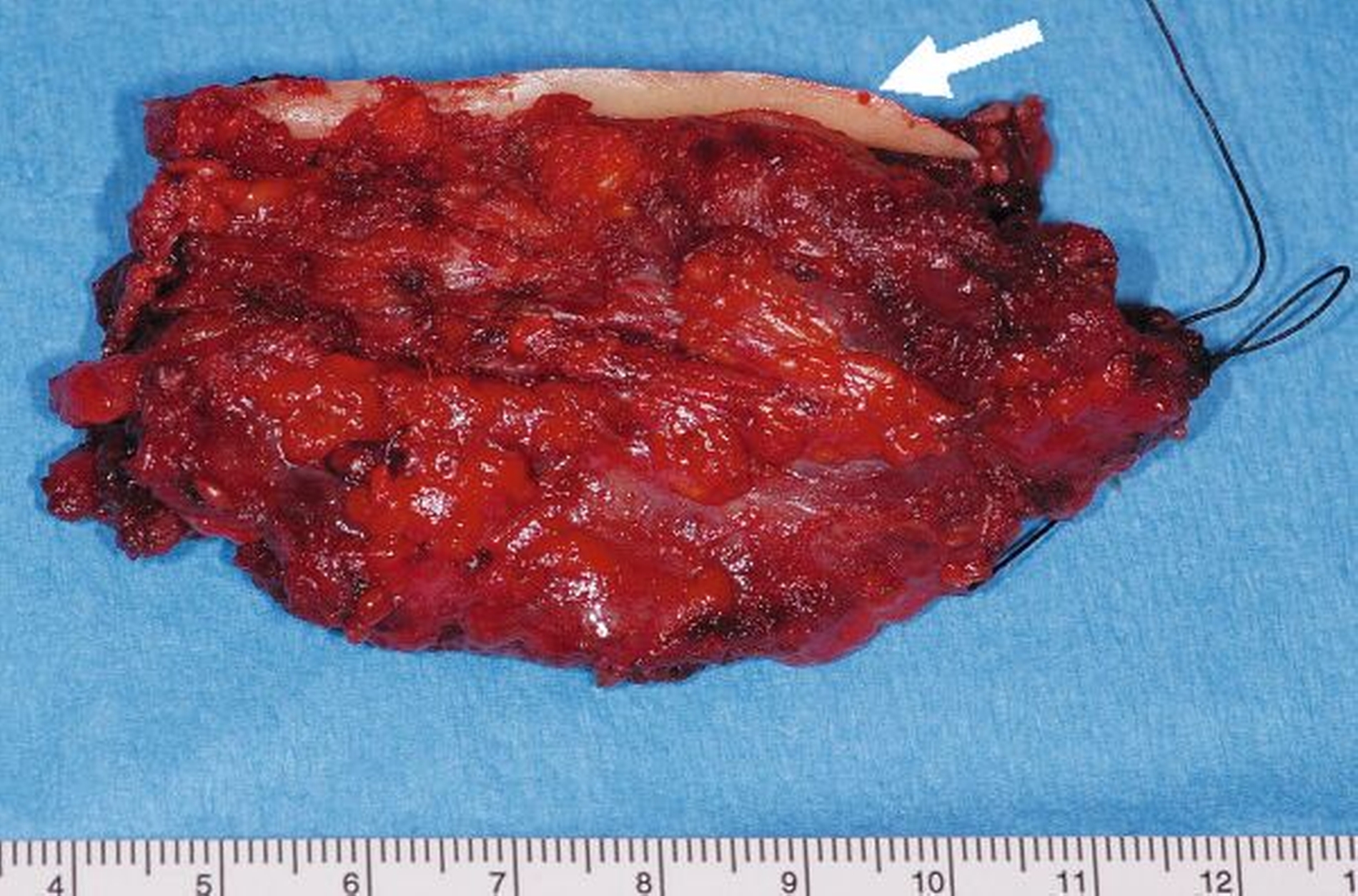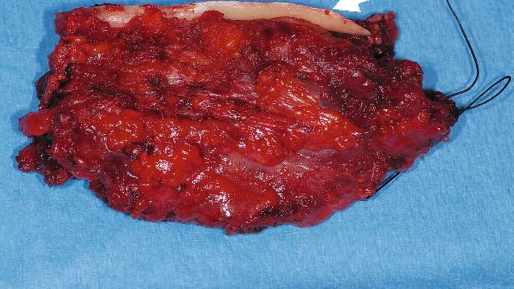 Die histopathologische Aufbereitung ergab schließlich ein Karzinom ex pleomorphem Adenom. Bei kleinherdigen Resten des pleomorphen Adenoms lagen Anteile eines insgesamt gering differenzierten, invasiven, duktalen Speicheldrüsenkarzinoms vor (Abbildungen 4 und 5). Aufgrund einer Infiltration in die angrenzende Skelettmuskulatur, einer angio-lymphatischen Karzinominvasion und einer Perineuralscheideninfiltration wurde in einem weiteren Eingriff nochmals nachreseziert. Es erfolgte die Resektion der basalen Anteile des Unterkiefers, des umliegenden Weichgewebes und die Entfernung der Lymphknoten der Level I bis V (Abbildung 6). Zur weiteren Therapie wurde mit dem Patienten die Durchführung einer adjuvanten Radiotherapie besprochen.