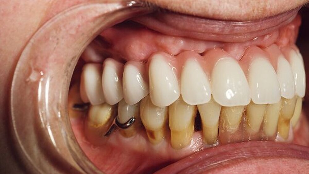 Zu Beginn der prothetischen Versorgung (Abbildung 6) und fast drei Jahre nach Konversion des gingivalen Phänotypes und anschließender Eingliederung einer verschraubten Brücke durch den Zahnarzt des Patienten, war das Weichgewebeprofil in regio 16 und 25 unverändert stabil (Abbildungen 7 a und 7 b).