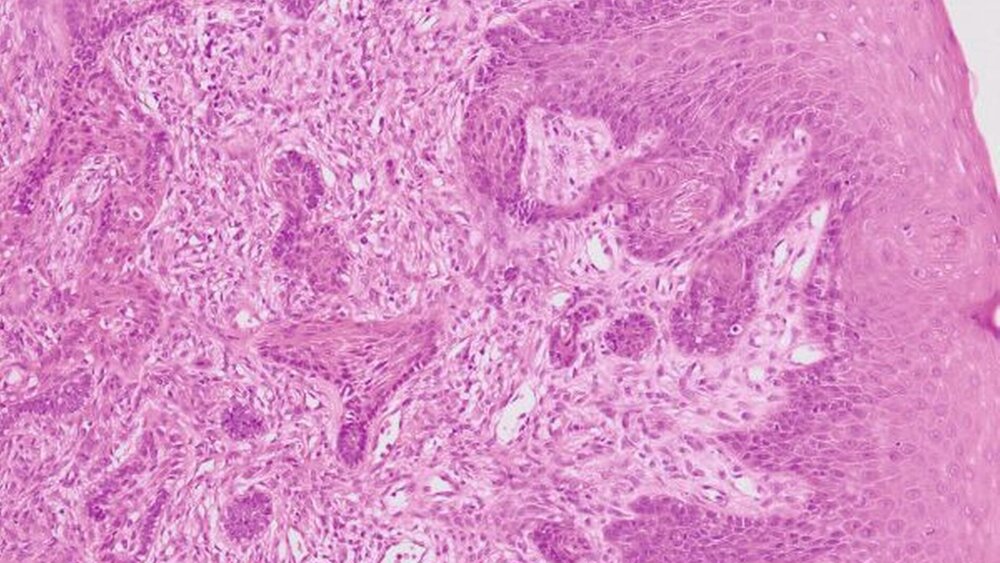 In der histopathologischen Aufbereitung zeigte sich ein teils trabekulär, teils solide wachsender Tumor mit Ausbildung polygonaler, unregelmäßig verzweigter konfluierender Zellnester, die mit breiter Invasionsfront an den basal gelegenen Knochen heranreichten und diesen oberflächlich erodierten, aber nicht infiltrierten (Abbildungen 3 und 4). Gegenüber der Schleimhaut entstand der Eindruck als fusionierten die neoplastischen Proliferate mit dem Oberflächenepithel der Gingiva beziehungsweise schienen von diesem auszugehen.