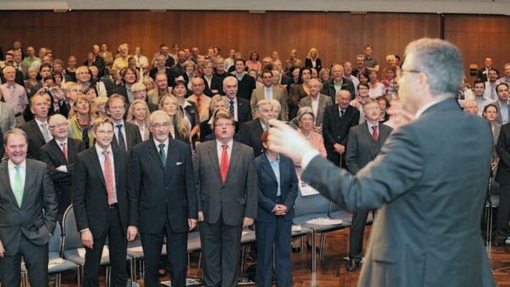 Wie familiär und ungezwungen die Würzburger Feierstunde ablief, bewies Prof. Dr. Bernd Klaiber mit seiner Gratulation an den Wissenschaftsminister. Denn der Zahnarzt Dr. Wolfgang Heubisch, seit 2008 Bayerischer Staatsminister für Wissenschaft, Forschung und Kunst und einer der Honoratioren im Festsaal, hatte selbst bei Klaiber Kurse besucht und just zum Festtag Geburtstag. Hierfür hatte dieser sich etwas Besonderes überlegt: Es wurde ein Ständchen gebracht. Mehrere Hundert Stimmen – alles zahnärztliche wohlgemerkt – sangen aus vollem Hals im Kanon für den Minister: ein Moment, den Heubisch nie vergessen wird und der sicherlich für die eine oder andere Entscheidung der Würzburger Zahnklinik auch positiv im Gedächnis behalten wird, wie er sagte. sp