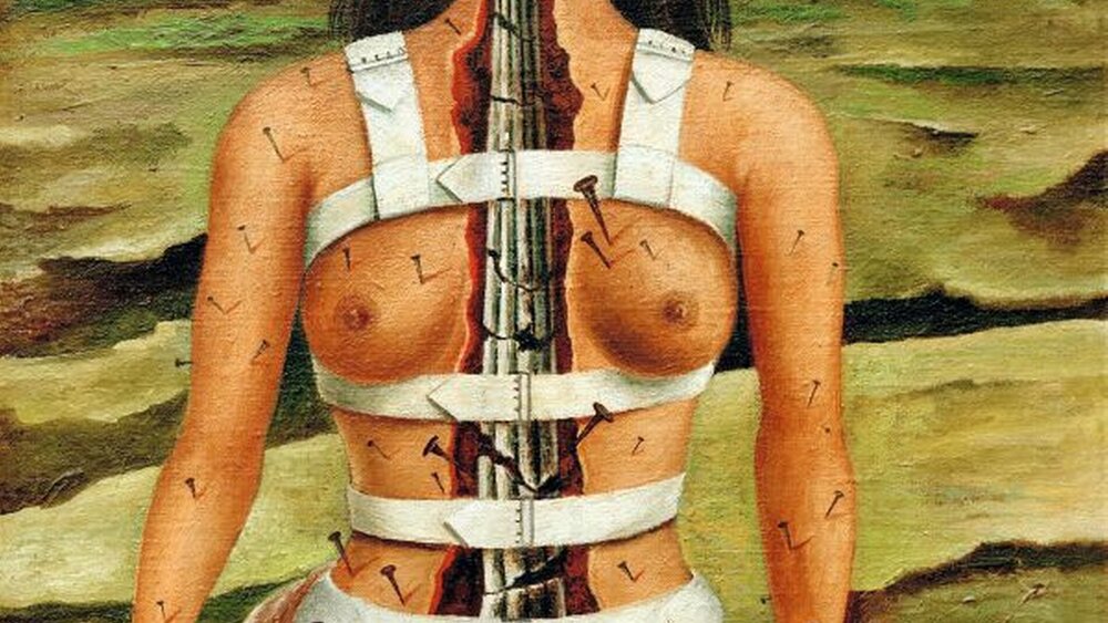 Zur fünften Kategorie zählen Darstellungen des Schmerzes, die bedingt durch die individuelle psychische und physische Schmerzbiografie der Künstler selbst entstanden. So spiegelt sich etwa im Werk der mexikanischen Künstlerin Frida Kahlo (1907–1954) in ganz besonderer Weise deren Schmerzbiografie in all ihren Facetten wider: Kinderlähmung, ein Busunfall, qualvolle Operationen, Fehlgeburten und – kurz vor ihrem Tod – eine Beinamputation [Prignitz-Poda, 2005; Scharf, 2005; Kettenmann, 2007]. Dass ein von Krankheiten, Unfällen und seelischen Schmerzen gezeichneter Lebenslauf bei einer so sensiblen Künstlerin wie Kahlo Spuren im Werk hinterlässt, ist unvermeidlich, was die Tatsache erklärt, dass sie ihre eigene Person auf fast allen Bildern in den Mittelpunkt stellt, so auch auf dem Bild mit dem Titel „Die gebrochene Säule“ (Abbildung 8). Kahlo erinnert mit dieser Illustration direkt an Werke der christlichen Märtyrerikonografie, etwa an die Gestalt des Heiligen Sebastian. Sie verarbeitet sämtliche physischen und psychischen Schicksalsschläge, die sie im Laufe ihres Lebens ereilt haben, in einzigartiger künstlerischer Verdichtung. Neben der Kinderlähmung in der Jugend waren es vor allem die Folgen des Verkehrsunfalls, die nachdrücklichen Einfluss auf ihr Leben hatten und sie mehrere Jahre ans Bett fesselten, was ihre künstlerische Kreativität jedoch wenig beeinträchtigte. Auf diesem Bild, das mittlerweile zu Recht zu einer Ikone der Schmerzdarstellung geworden ist, konzentrieren sich alle Schmerzerlebnisse ihres Lebens auf eindrucksvolle Weise. Kahlo verarbeitet nicht nur ihr körperliches Leid, sondern sie gibt auch dem auf den ersten Blick nicht sichtbaren Schmerz ihrer zutiefst verletzten Seele Ausdruck (sie wurde von ihrem Ehemann, dem Künstler Diego Rivera, betrogen). Dieser Schmerz wird allerdings kaum im Gesichtsausdruck, der – von den Tränen einmal abgesehen – wenig emotionale Regung zeigt, reflektiert. Vielmehr zeigt er sich in der gesamten Körperauffassung, wobei der klaffende Riss, der durch ihren Körper geht, im Hintergrund in den Furchen der aufgerissenen Landschaft wieder aufgenommen wird.