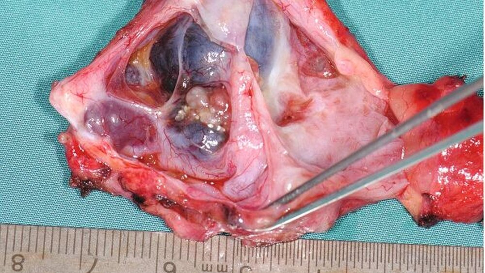 Im Anschnitt des Präparats zeigten sich dann allerdings eine ungewöhnliche Septierung und vor allem einige Kammern mit papillomatösen Proliferaten, die sich bei einer Halszyste auch nach mehreren Entzündungsepisoden nicht darstellen (Abbildung 4). Insofern musste die Verdachtsdiagnose einer lateralen Halszyste infrage gestellt werden. Letztlich ergab die histopathologische Untersuchung die Diagnose eines papillären Schilddrüsenkarzinoms.