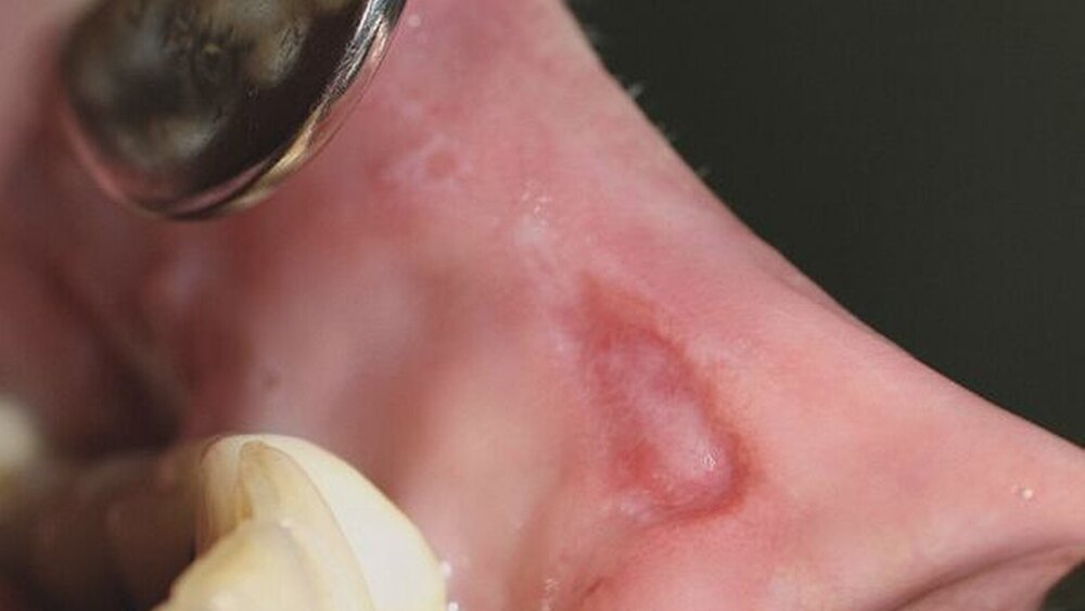 Der 42-jährige Patient stellte sich zur Abklärung einer leicht schmerzhaften Mundschleimhautveränderung der rechten Wange mit angrenzender Schwellung vor. Zuvor sei ein oraler Herpes simplex aufgetreten und anschließend abgeheilt. Außerdem sei es bei einer gewalttätigen Auseinandersetzung zu einer Verletzung des rechten Mundwinkels gekommen. Der Patient vermutete einen Zusammenhang zur aktuell vorliegenden Veränderung.