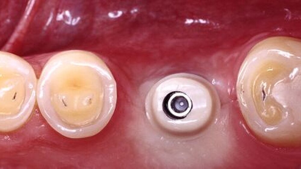 Zahnfarbene Materialien bieten in der ästhetischen Zone gewisse Vorteile, wenn es, unter ungünstigen strukturellen Bedingungen, zu einer Frei- legung der Abutment-Oberfläche kommen sollte. Angesichts dieser Problematik wurde in einzelnen Fällen versucht, ein Titan-Abutment mit Sinterkeramik zu überschichten, um darauf anschließend eine vollkeramische Krone platzieren zu können (Abbildung 1). Prestipino und Ingber stellten im Jahr 1993 ein dicht gesintertes Aluminiumoxid-Abutment als vollkeramische Alternative zu metallbasierten Versionen im Frontzahnbereich vor [Prestipino Ingber, 1993]. Nach einer direkten Abformung des Implantats wurden Zylinder aus hochreiner, dicht gesinterter Aluminiumoxid-Keramik labortechnisch unter hohem Zeitaufwand für die Aufnahme vornehmlich vollkeramischer Kronen präpariert.