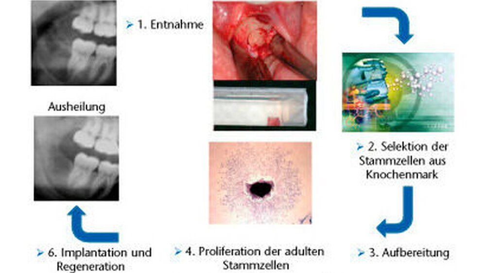 Der Schwerpunkt der klinischen Umsetzung von Tissue Engineering und Regenerativen Therapien (Abbildung 6) betrifft zurzeit vor allem die mesenchymalen Gewebe, allen voran Knochen und Knorpel [Handschel et al., 2006; Caplan, 2007], deren Erfolg in verschiedenen klinischen Fallstudien untersucht wird. Bezogen auf die zukünftige Entwicklung dieses Bereichs sind jedoch vielfältige Faktoren vorhanden, die die Dynamik limitieren können. So sind der erhebliche technische, apparative, logistische und damit ökonomische Aufwand solcher Therapien, wie auch ethische Aspekte des Einsatzes von Stammzellen, Faktoren, die die Entwicklung dieses Bereichs einschränken [Lee et al., 2010]. Zudem hat sich gezeigt, dass auch biologische Aspekte der Stammzellentwicklung die klinische Umsetzung von neuen Therapiestrategien zurzeit verzögern [Choumerianou et al., 2008]. Es bleibt daher abzuwarten, in welcher Form sich dieser Biomedizinbereich im Spektrum der klinischen Zahnmedizin und Humanmedizin etabliert. Sicher ist allerdings, dass offensichtlich von einer rapide zunehmenden Zahl von Wissenschaftlern diesem relativ jungen Zweig der Medizin enormes Potenzial zugeschrieben wird.