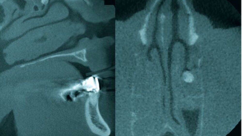 Osteome sind gutartige Tumoren, die durch ein langsames Wachstum charakterisiert sind. Sie können ihren Ursprung sowohl von der Kompakta als auch von der Spongiosa nehmen und spontan in jedem Lebensalter auftreten. Eine Geschlechtsprävalenz findet sich nicht einheitlich, sondern wird – je nach Studienpopulation – in der Literatur wechselnd für das weibliche oder männliche Geschlecht beschrieben. Die häufigste Lokalisation stellt der Unterkiefer zumeist im Kieferwinkelbereich dar, gefolgt von den Nasennebenhöhlen. Innerhalb der Nasennebenhöhlen ist am häufigsten der Sinus frontalis betroffen (Abbildung 5), Ethmoidalzellen und Kieferhöhle sind mit jeweils circa zwei Prozent eher selten betroffen. Eine Lokalisation in der Orbita ist eine Rarität.