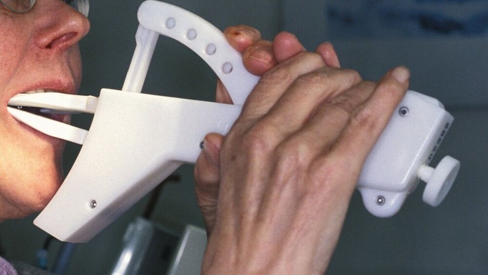 Am folgenden Tag konnte die fertige Oberkiefer-Obturatorprothese eingegliedert (Abbildungen 10a bis 10 g) und mittels der Methode nach Gerber nachregistriert werden. Abschließend erfolgten Prothesen- und Mundhygieneinstruktionen sowie die Demonstration von Dehnungsübungen mittels eines tragbaren Rehabilitationssystems (TheraBite®, Atos Medical, Troisdorf, Deutschland) (Abbildung 11). Zu diesem Zeitpunkt betrug die maximale Mundöffnung nur noch 17 Millimeter. Vorherige Dehnungsübungen waren nicht möglich, da die Apparatur beziehungsweise der Zungenspatel nicht adäquat an der mit dem Restgebiss locker verbundenen Interimsversorgung abgestützt werden konnten.