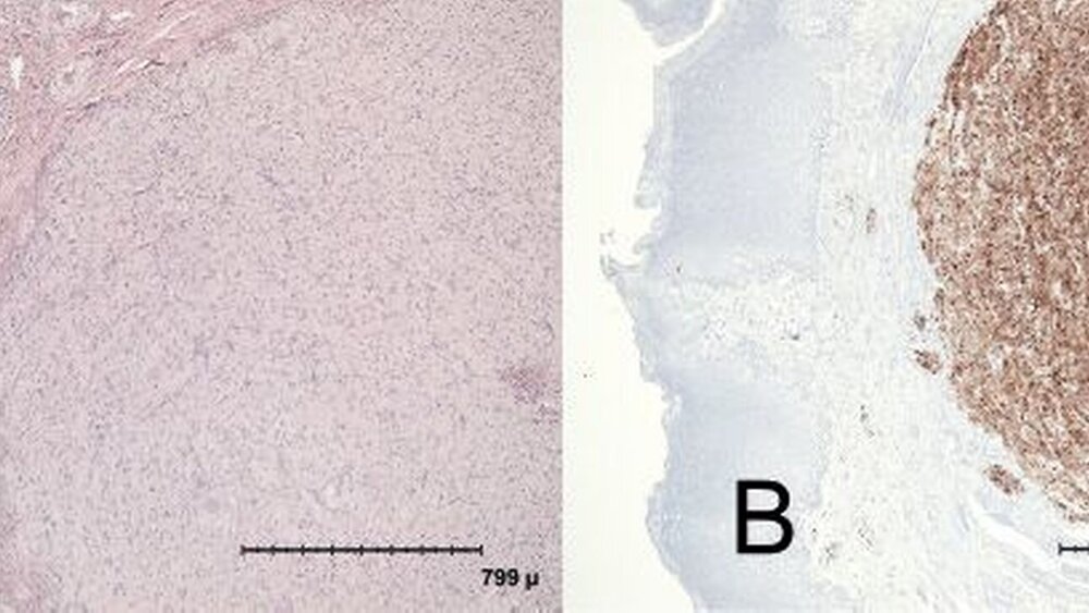 Die Patientin ließ sich den Befund heimatnah exstirpieren. Die histologische Aufbereitung des Präparats erbrachte die Diagnose eines zur Tiefe hin R1-resezierten Granularzelltumors (Abbildung 2). Daraufhin erfolgte die Wiedervorstellung, wobei sich ein inspektorisch unauffälliger Zungenbefund zeigte. Lediglich im Tastbefund war eine Resistenz in der tiefen Muskelschicht eruierbar. Die sonografische Untersuchung der Zunge zeigte keinen eindeutig abgrenzbaren Befund.In Intubationsnarkose erfolgte eine Nachresektion unter Wahrung eines Sicherheitsabstands. Die histopathologische Aufarbeitung des Präparats erbrachte keinen erneuten Nachweis des zuvor beschriebenen Granularzelltumors.