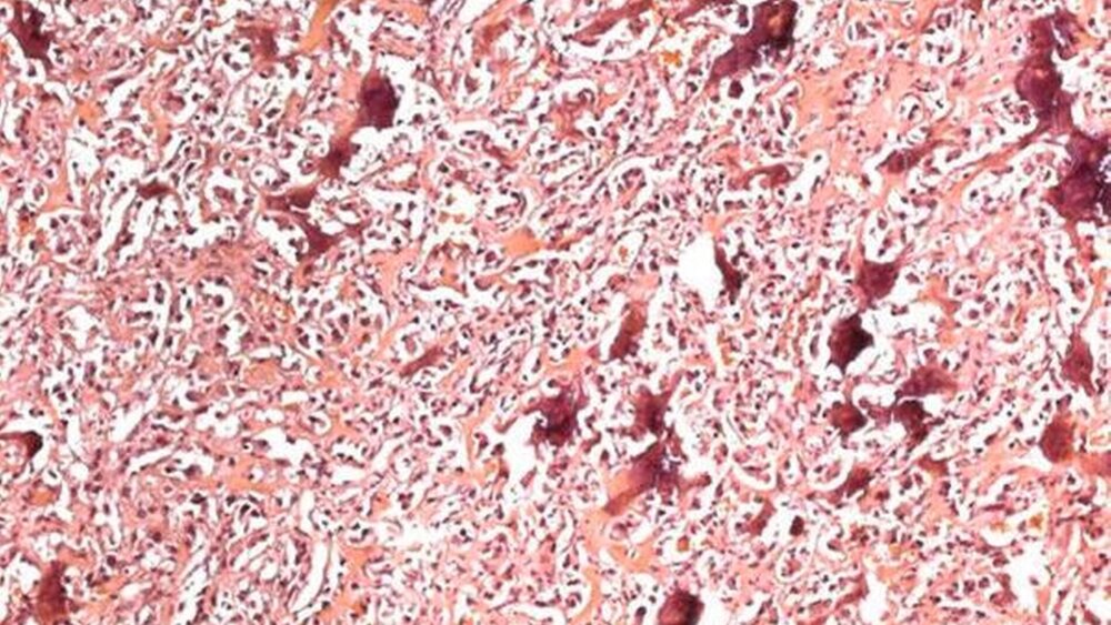 Acht Wochen nach der zweiten Knochenabtragung klagte die Patientin über eine erneute Schwellung und einen Gewebsüberschuss intraoral ohne Schmerzen. Aufgrund der schnell wachsenden Raumforderung wurde erneut eine modellierende Osteotomie zur Gewinnung einer Gewebsprobe durchgeführt. Der histopathologische Befund der dritten Unterkieferrevision ergab die Diagnose eines hochmalignen Osteosarkoms mit osteoblastomähnlichem Wachstumsmuster.