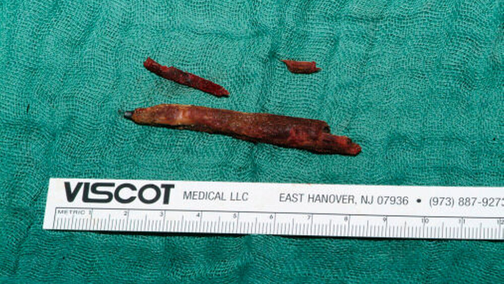 Der Defekt des Augenhöhlenbodens wurde durch einen infraorbitalen Zugang mit einer resorbierbaren PDS-Folie gedeckt. Bei dem geborgenen Objekt handelte es sich um einen fast sieben Zentimeter langen Bleistift, der nach 15 Jahren in der Kieferhöhle noch funktionstüchtig war (Abbildung 6). Der histopathologische Befund des entnommenen Gewebes, das sich um den Bleistift herum gebildet hatte, ergab eine chronische Entzündung mit teils erosiv-ulzerösen Ausprägungen. Bereits wenige Tage nach dem Eingriff waren die Beschwerden stark rückläufig und der Patient konnte in gutem Allgemeinzustand aus der Klinik entlassen werden. Die Visusminderung des rechten Auges, am ehesten bedingt durch die chronische Entzündung, blieb persistent.