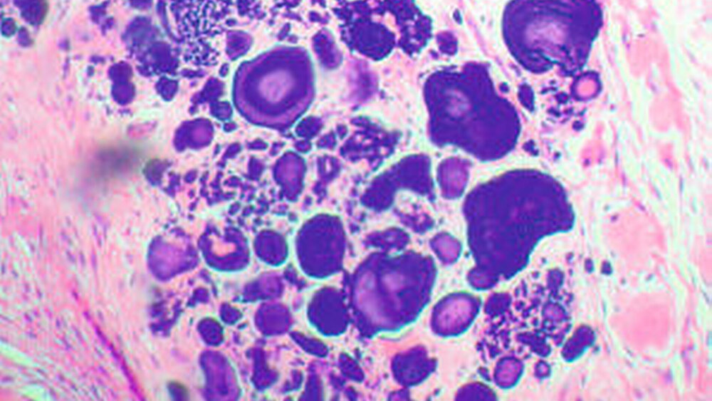 Weiterhin ließ sich in der Probe eine ausgeprägte, ringförmige Kalzifizierung (Abbildung 6) nachweisen. Diese Ergebnisse, zusammen mit der klinischen Untersuchung, wiesen auf einen kalzifizierenden epithelialen odontogenen Tumor hin. Daher wurde die Läsion in Vollnarkose mit Sicherheitsabstand in toto exzidiert.