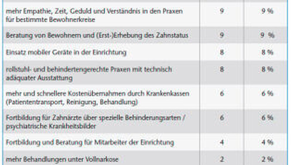 Der Wunsch nach rollstuhl- und behindertengerechten Praxen und nach Behandlungsmöglichkeiten unter Narkose (zusammen 10 Prozent) passt zu den entsprechenden Gründen für die Nichtbehandlung. Unter den weiteren Vorschlägen finden sich beispielsweise Wünsche an die Adresse der Kostenträger, Wünsche nach mehr Engagement von Angehörigen der Heimbewohner, nach flexiblen Terminen in Zahnarztpraxen und nach mehr Zeit in den Praxen. Etwas außergewöhnlich, aber durchaus plausibel ist der Wunsch eines Altenpflegeheims nach einem Behandlungsstuhl „als Spende oder Geschenk“.