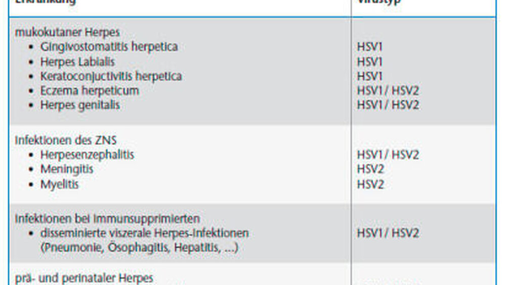 Prinzipiell können sich HSV-Infektionen in jedem Organsystem manifestieren, der Befall von inneren Organen und dem Zentralnervensystem ist selten, aber mit hohen Komplikationsraten behaftet [Gross, 2004]. Besondere Bedeutung kommt lebensbedrohenden Infektionen von Neugeborenen im Rahmes des Herpes neonatorum zu. Klinisch wird unterschieden zwischen den primären und den sekundären (rezidivierenden) Herpesmanifestationen. In der Tabelle sind die HSV-assoziierten Erkrankungen zusammengefasst [Gross, 2004].