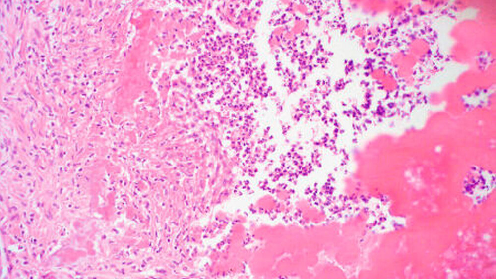 Die histopathologische Aufbereitung ergab das Vorliegen einer radikulären Zyste, bei Zahnresten mit nekrotischer Pulpitis und Parodontitis und dem Vorliegen eines ausgeprägten Bakterienrasens.