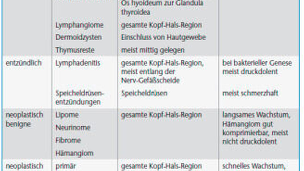 Raumforderungen der Kopf-Hals-Region beim Erwachsenen lassen sich meist auf drei Ursachen zurückführen: auf kongenitale, entzündliche oder neoplastische Ursachen (Tabelle). Alter des Patienten, Anamnese und klinische Untersuchung mit Eruierung der genauen Lage des Befunds sind hier bereits hinweisgebend.