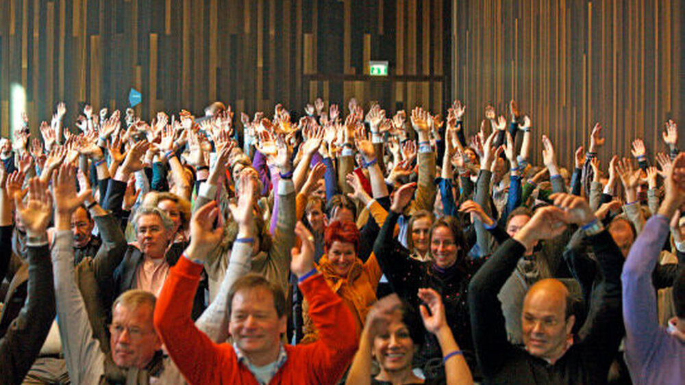 Entsprechend ihres Auftrags als Physiotherapeutin unterbrach die Referentin Martina Sander ihren Vortrag und brachte damit nicht nur den Kreislauf der Teil- nehmer in Schwung (Foto unten), sondern auch die steif gesessenen Muskeln und Bänder. Denn alle Kongressteilnehmer mussten turnen! Und hatten viel Spaß dabei. Die Physiotherapeutin ist spezialisiert auf die Therapie von CMD-Patienten und legt besonderen Wert darauf, dass bei jeder CMD-Behandlung auch eine funk- tionelle Behandlung der Halswirbelsäule erfolgt.