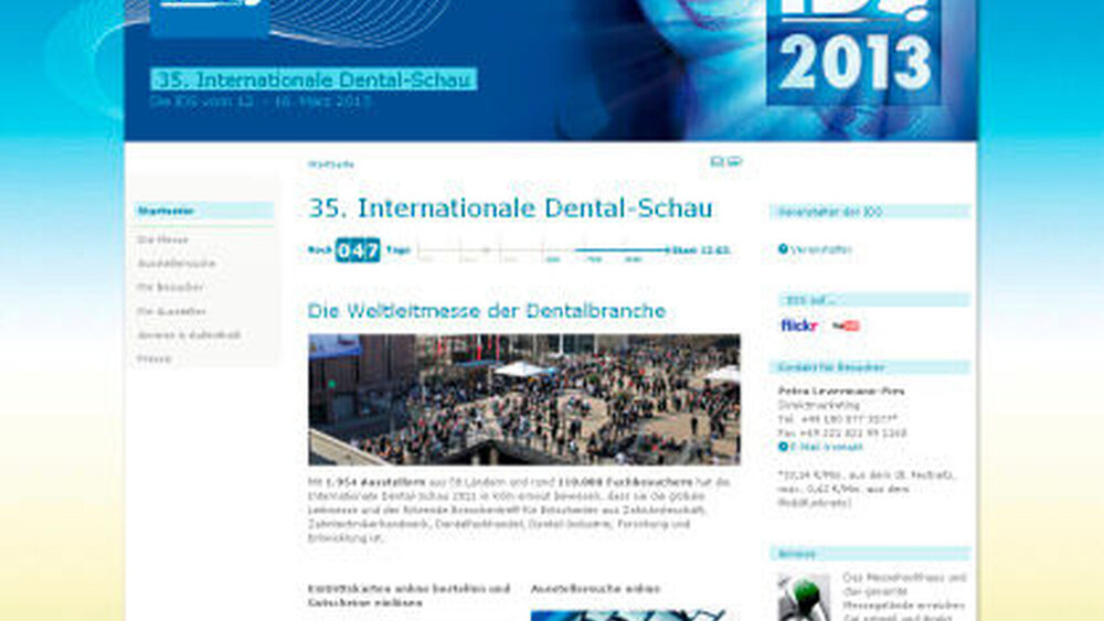 Der Menüpunkt „Events Veranstaltungen“ (unter Die Messe) führt schließlich zu Informationen über zahlreiche Termine rund um die Messe: Wie bei jeder IDS wird es Vor- träge und Präsentationen zu Produkten und Behandlungsmethoden in der Speaker’s Corner geben. Die Bundeszahnärztekammer bietet ein reichhaltiges Informationsprogramm mit Fachinformationen, Diskussionsrunden und ein abendliches Get-Together. Nach einem anstrengenden Messetag sollte man oder frau sich diese Möglichkeit zum kollegialen Austausch nicht nehmen lassen.
