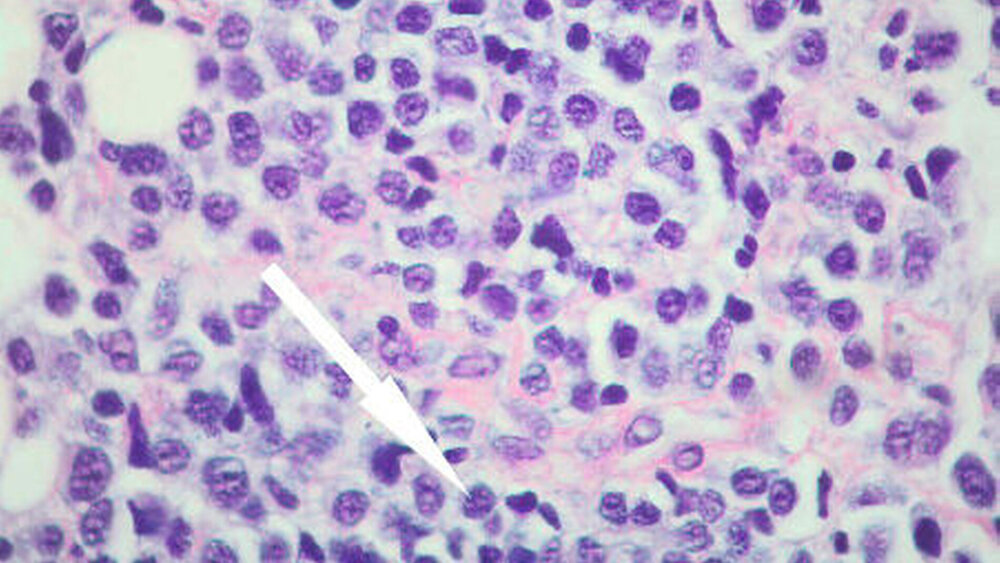 Die feingewebliche Untersuchung bestätigte den Verdacht der Myelommanifestation im Unterkiefer und im Bereich der Stirn mit flächenhaften Infiltraten atypischer, plasmazytoider Zellen mit deutlich vergrößerten rundlich-ovalären und teilweise mehrkernigen Zellkernen (Abbildung 4).
