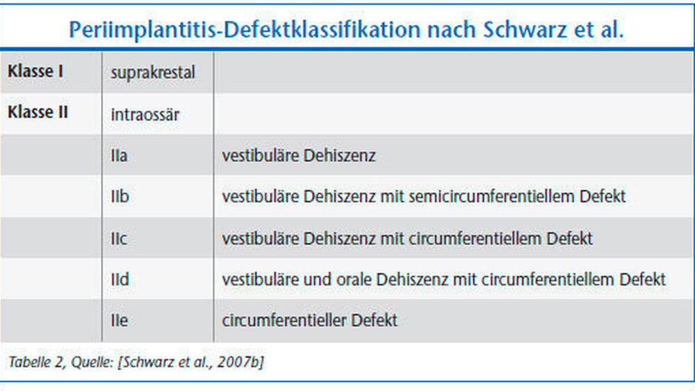 Die hieraus resultierenden periimplantären Knochendefekte lassen sich in definierbare Klassen untergliedern [Schwarz et al., 2007a]. Grundsätzlich kann man eine intraossäre (Klasse I) von einer supraalveolären (Klasse II) Defektkomponente unterscheiden.