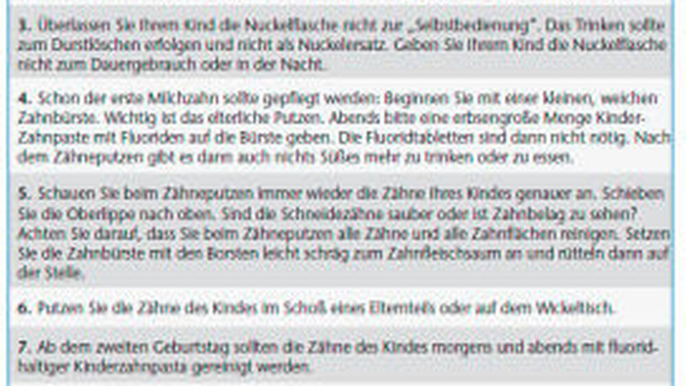 Ausdrücklich ist darauf hinzuweisen, das nächtliche Trinken von zuckerhaltigen Getränken aus der Nuckelflasche zu unterbinden [AADP, 2008], den häufigen Konsum kariogener Flüssigkeiten zu vermeiden und Kinder ab dem ersten Geburtstag an das Trinken aus einem Becher beziehungsweise Glas zu gewöhnen. Insbesondere die Kariogenität des Flascheninhalts ist für die Kariesentwicklung ausschlaggebend [Reisine et al., 1998].