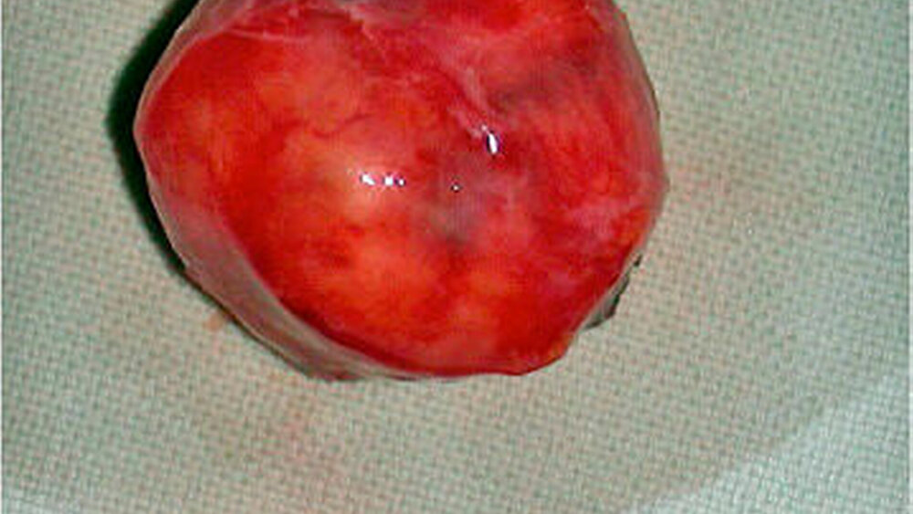 In Lokalanästhesie erfolgte die Entfernung der Raumforderung (Abbildung 4) über einen enoralen Zugang, nachdem der Stenongang zuvor identifiziert und im Folgenden geschont wurde. Die Raumforderung lag unmittelbar unterhalb der Mukosa und wurde nach außen von Muskel bedeckt.