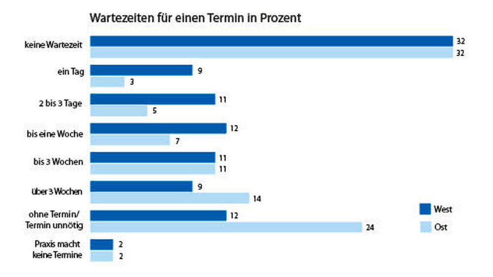 Bei den Wartezeiten gibt es ein Ost-West-Gefälle: Zwischen Rostock und Erfurt müssen die Patienten am längsten auf einen Sprechstundentermin warten – 14 Prozent von ihnen mehr als drei Wochen. Der KBV-Chef sieht darin ein Anzeichen für einen Ärztemangel. Denn im Westen musste sich nicht einmal jeder Zehnte über drei Wochen gedulden. Allerdings gab knapp ein Drittel der Befragten in Ost wie in West an, dass sie den Arzt ohne Wartezeit sprechen konnten. In der Arztpraxis selbst warteten zwölf Prozent der Patienten überhaupt nicht, aber ein Viertel länger als eine halbe Stunde.