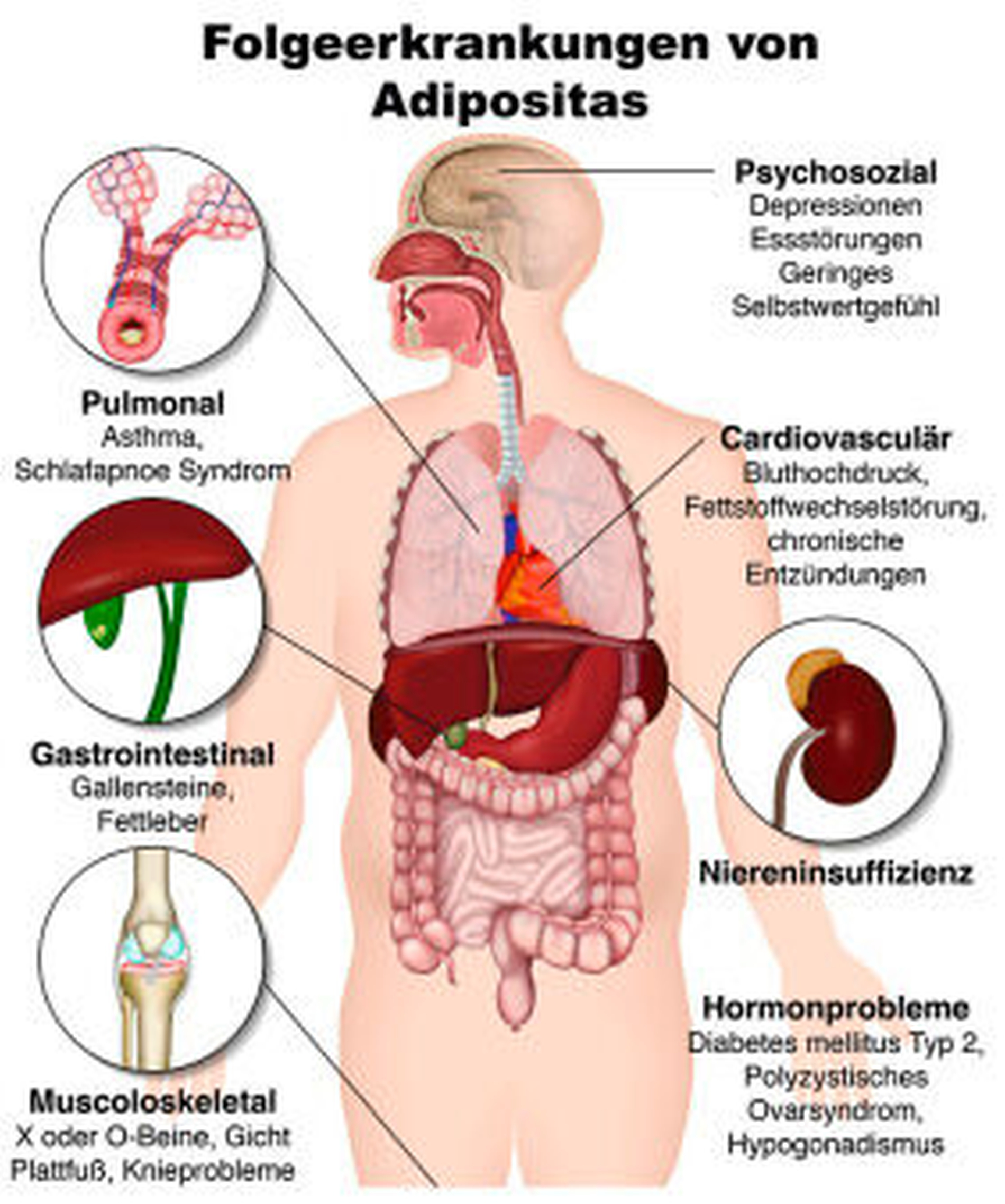 Zu den Komplikationen, die in ihrer Entwicklung durch eine Fettleibigkeit eindeutig forciert werden, gehören die Hypertonie, die Dyslipidämie und auch der Diabetes mellitus und somit insgesamt das metabolische Syndrom. So ist das Risiko, eine Hypertonie und/oder eine Dyslipidämie zu entwickeln, bei Vorliegen einer Adipositas um das Zwei- bis Dreifache erhöht. Vergleichbar hoch ist auch das Risiko für die Manifestation einer koronaren Herzerkrankung sowie weiterer Erkrankungen wie der Gonarthrose, der Gicht und einer Refluxösophagitis. Um mehr als das Dreifache ist sogar das Risiko für einen Diabetes gesteigert, für eine Insulinresistenz, eine Cholezystolithiasis, eine Fettleber und ein Schlaf-Apnoe-Syndrom. Adipöse Menschen entwickeln zudem häufiger als Normgewichtige Karzinome, ein polyzystisches Ovar-Syndrom, eine Cox-arthrose und Rückenschmerzen.