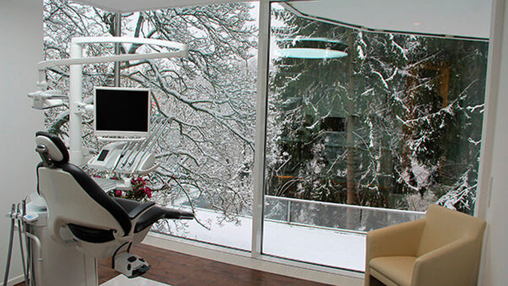 Bodentiefe Fenster ermöglichen einen entspannten Blick in den benachbarten Wald. „Das kommt extrem gut bei den Patienten an“, sagt Praxisinhaber Dr. Jens Holländer. Insbesondere Angstpatienten profitieren von dem tollen Ausblick aufs Blättermeer: „Sie lassen sich fast immer ablenken. Das helle und freundliche Klima ist außerdem für die Arbeitsatmosphäre sehr ansteckend.“