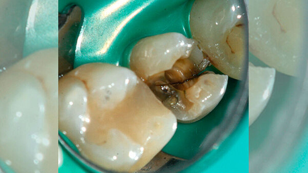 Erschwerend kam hinzu, dass bei der Patientin eine komplette Längsfraktur des Zahnes vorlag. Da sich auch nach einem halben Jahr die Situation komplikationslos darstellte, wurde entschieden, den Zahn zu diesem Zeitpunkt mit einer Teilkrone zu versorgen, um das Risiko einer erneuten Fraktur durch auftretende Scherkräfte zwischen den beiden Höckern zu minimieren. Alternativ hätte man – um dieses Risiko von Beginn an zu reduzieren – auch kurz nach der initialen Behandlung eine Tabletop-Präparation mit vorübergehender Kompositversorgung anfertigen können.