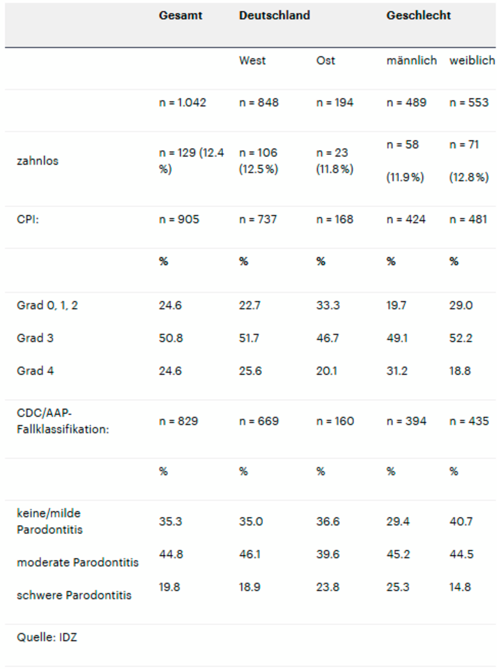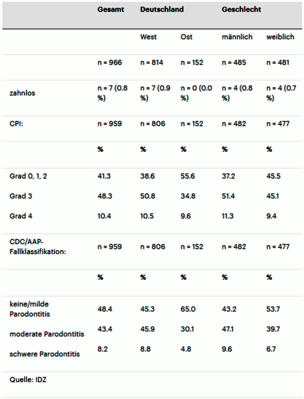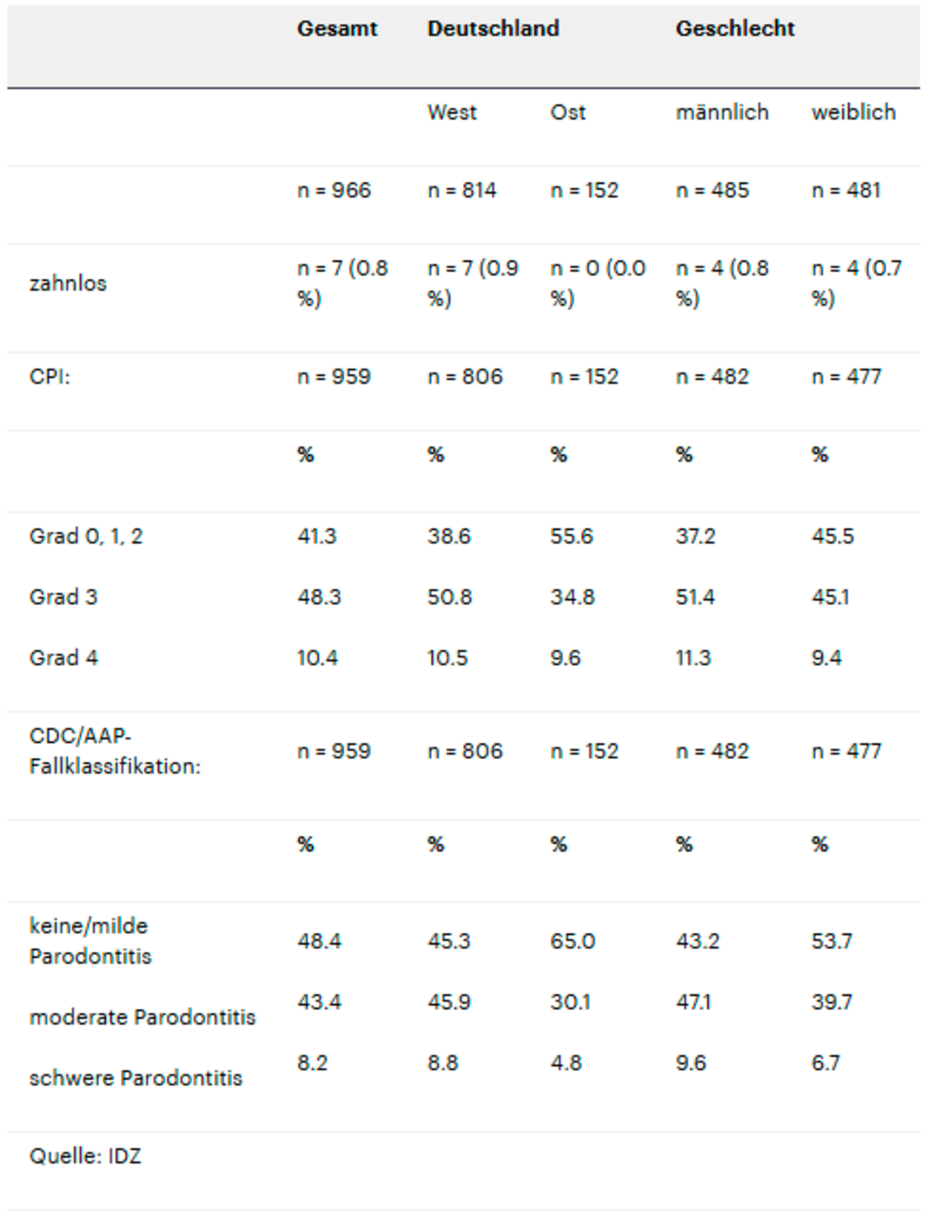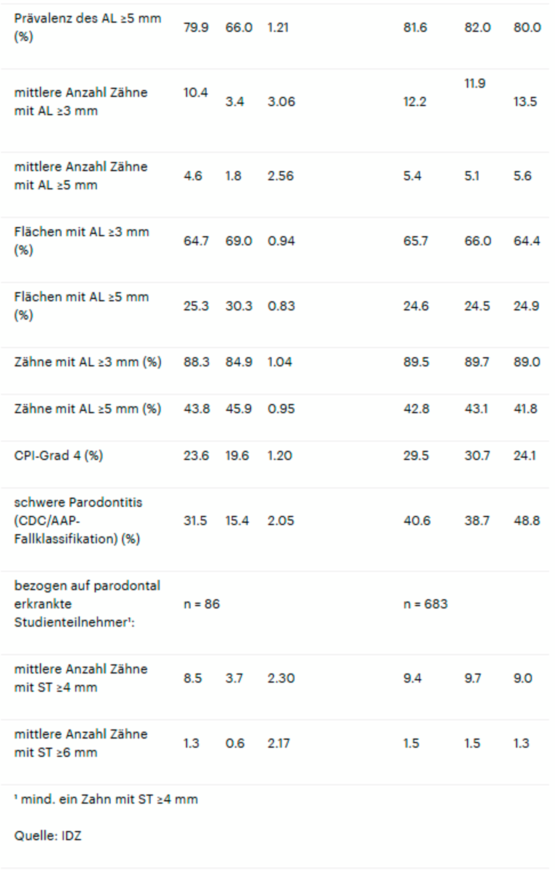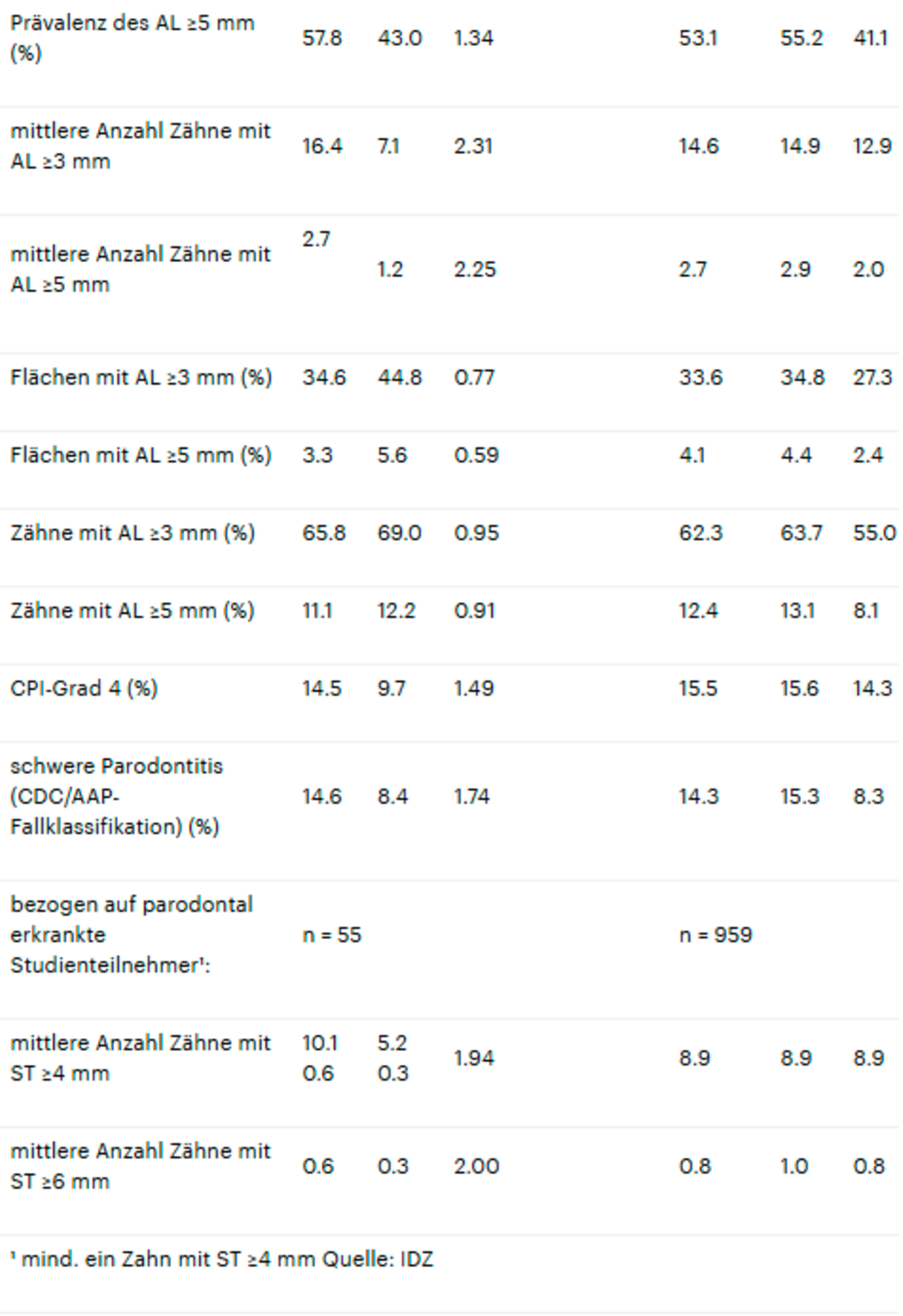 Rechnet man nun die Prävalenzen für alle Studienprobanden auf ein Full-Mouth- Recording hoch, sind bei den jüngeren Erwachsenen eher 15,5 Prozent (statt 10,4 Prozent) und bei den jüngeren Senioren 29,5 Prozent (statt 24,6 Prozent) schwer parodontal (CPI-Grad 4) erkrankt. So betrachtet, wären die parodontologischen Mundgesundheitsziele 2020 verfehlt. Diese Argumentation erscheint jedoch nicht ganz fair, denn als diese Ziele 2003 global von der Weltgesundheitsorganisation (WHO) und der Federation Dentaire International (FDI) entwickelt und für Deutschland angepasst wurden (1), war dieses Umrechnungsverfahren noch nicht entwickelt und die Parodontalepidemiologie fußte auf Partial-Mouth-Recordings. Obendrein ist die von der WHO favorisierte Klassifikation parodontaler Erkrankungen nach dem Community Periodontal Index nicht mehr unumstritten. Bereits 2007 wurde von den Centers for Disease Control and Prevention (CDC) und der American Academy of Periodontology (AAP) eine neue Parodontitis-Fallklassifikation vorgestellt (8), mit dem Vorteil, dass sie neben Sondierungstiefen auch Attachmentverluste zur Falldefinition Parodontitis berücksichtigt. Sondierungstiefen zeigen zwar die aktuelle Erkrankungslast an, eine Erfassung der Parodontitiserfahrung unter Berücksichtigung auch zurückliegender Erkrankungsschübe ist damit allerdings weniger gut möglich.