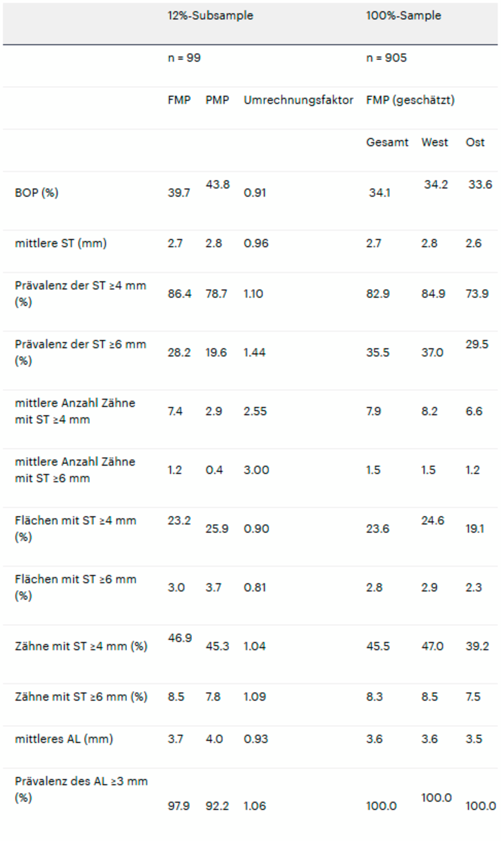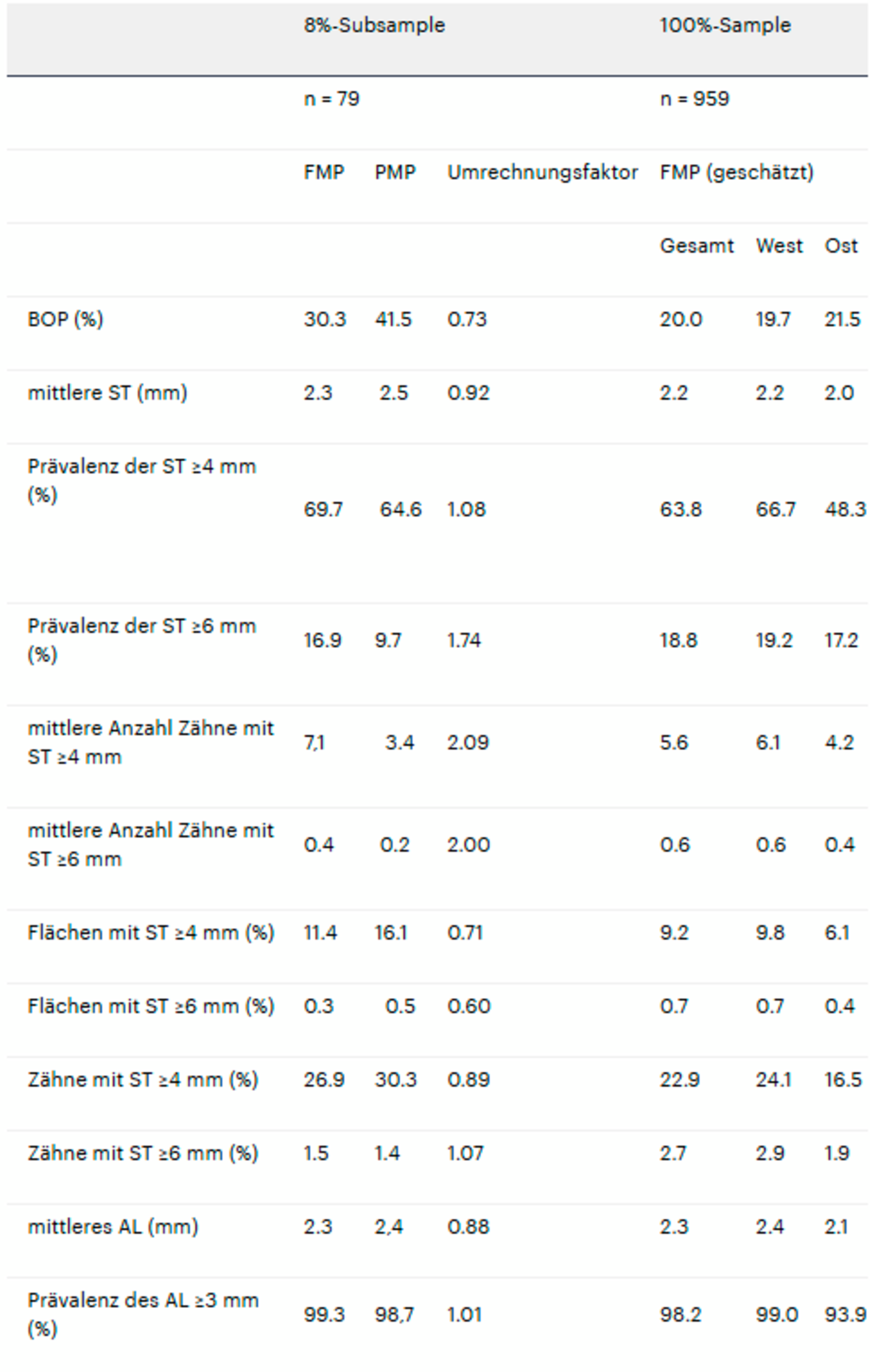 Die Methodik in der DMS V zur Erfassung parodontaler Erkrankungen geht über den bisherigen Standard weit hinaus (3). Aus epidemiologischen Vergleichen ist mittlerweile bekannt, dass Partial-Mouth-Recordings, wie etwa die Sondierungstiefenmessung an Indexzähnen, grundsätzlich zu einer Unterschätzung der Prävalenz führen (4-6). Wenngleich die meisten Probanden weiterhin in Form eines Partial-Mouth-Recordings befundet werden können, sehen aktuelle Empfehlungen daher vor, eine Teilgruppe einem Full-Mouth-Recording zu unterziehen (7). Mit diesem Verfahren kann anschließend für die gesamte Stichprobe ein Full-Mouth-Recording hochgerechnet werden. Diesen jüngsten Standards, die auch von der Europäischen Föderation für Parodontologie (EFP) empfohlen werden, wurde in der DMS V gefolgt. Bei 92 Prozent der Studienteilnehmer der jüngeren Erwachsenen und bei 88 Prozent der jüngeren Senioren erfolgte die Befundung an den zwölf Indexzähnen, die auch in der DMS IV Grundlage der parodontalepidemiologischen Befundung waren: Zähne 17, 16, 11, 24, 26, 27, 37, 36, 31, 44, 46 und 47. Die Messungen fanden an drei Stellen je Zahn statt: mediovestibulär, mesiovestibulär und distooral. Für die Indexzahnmessung gab es eine spezifische Ersatzzahnregelung für den Fall, dass vorgesehene Indexzähne nicht vorhanden waren. Bei einem zufallsgezogenen Sub- sample von 8 Prozent der jüngeren Erwachsenen und von 12 Prozent der jüngeren Senioren erfolgte ein Sechs-Punkt-Full-Mouth-Recording an folgenden Messstellen: distovestibulär, mediovestibulär, mesiovestibulär, mesiooral, mediooral und distooral.