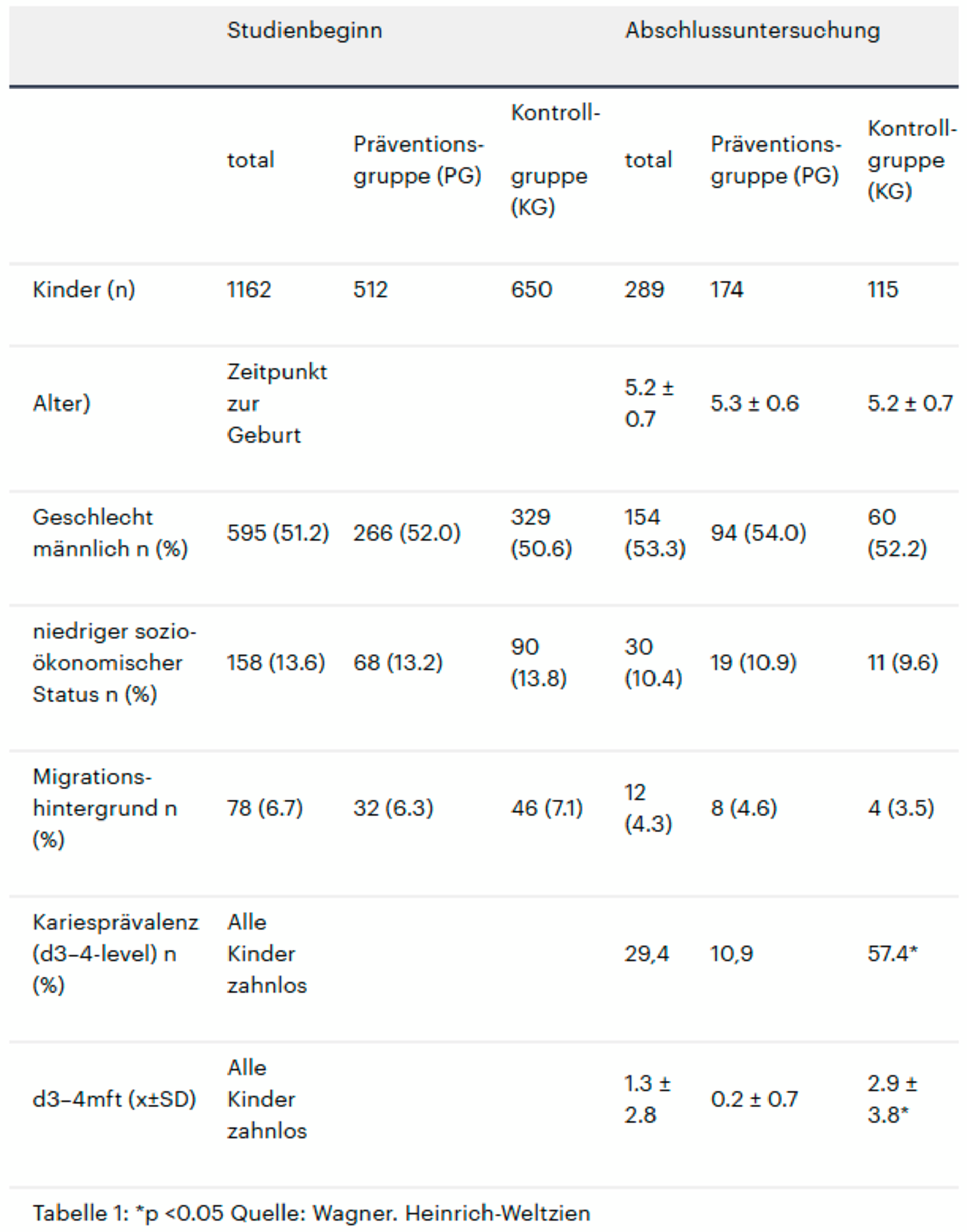 Die vorliegende Studie basiert auf Daten einer regionalen Geburtskohorte in Deutschland. Die Arbeitshypothese, dass durch eine frühzeitige Aufklärung und durch präventive Interventionen mit einem Zahnarztbesuch im ersten Lebensjahr mit nachfolgenden, kariesrisikoabhängigen, regelmäßigen zahnärztlichen Kontrollen sowie Fluoridlack-Applikationen der frühkindlichen Karies effektiv vorgebeugt werden kann, wurde bestätigt.