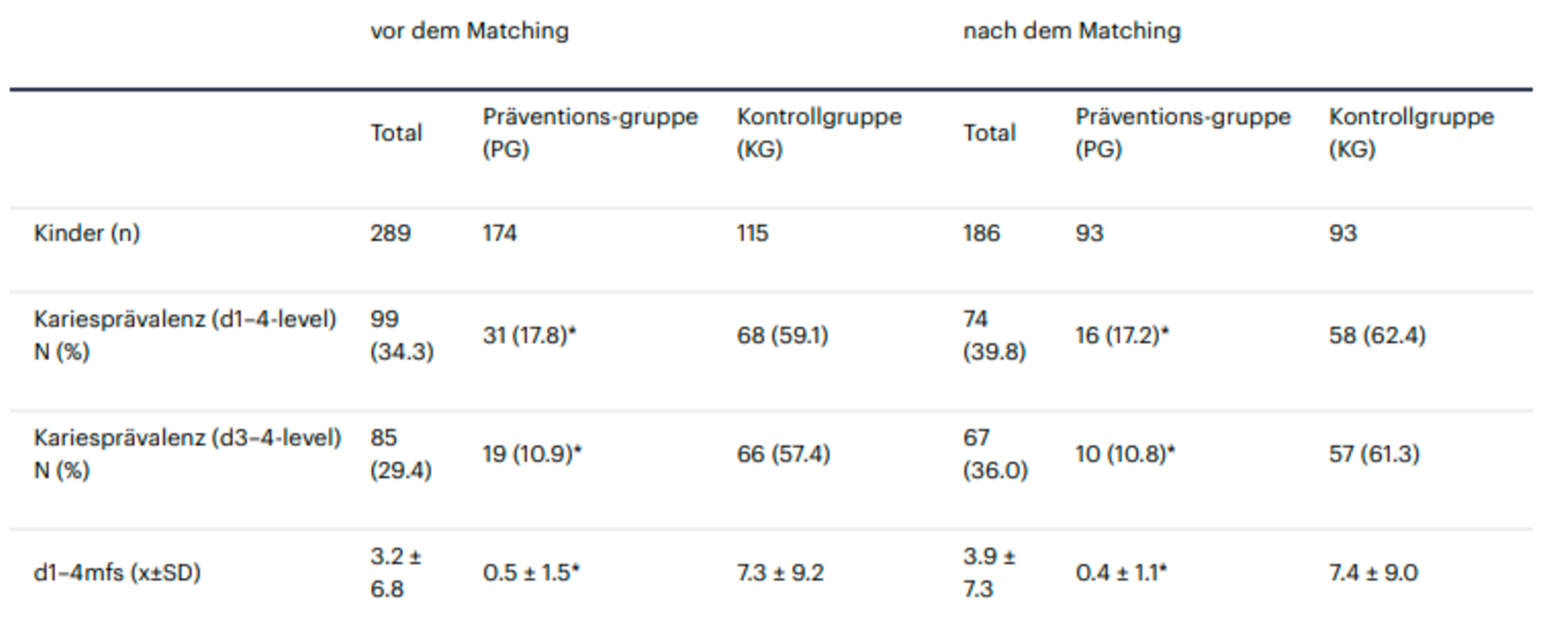 Die Kariesprävalenz, der Kariesbefall und der Sanierungsgrad in der PG und in der KG vor und nach dem Matching sind in Tabelle 2 zusammengestellt. Kinder im PP hatten eine signifikant niedrigere Kariesprävalenz und einen geringeren Kariesbefall auf Schmelz- und Dentinkaries-Niveau als die Kinder der KG (p 0,05). Der SiC der Kinder in der PG betrug 0,4 ± 0,9 d3-4mft verglichen mit 4,3 ± 3,2 d3-4mft in der KG (p 0,001). Während alle PG-Kinder saniert waren (100 Prozent), lag der Sanierungsgrad der KG-Kinder bei 47,3 Prozent. PG-Kinder hatten ihren ersten Zahnarztbesuch im ersten Lebensjahr, KG-Kinder besuchten den Zahnarzt im Alter von 3,6 ± 0,6 Jahren. Die durchschnittliche Anzahl der Zahnarztbesuche betrug 10,5 ± 3,4 in der PG und 3,3 ± 1,4 in der KG. Alle PG-Kinder erhielten durchschnittlich 5,8 ± 2,7 lokale Fluoridlack-Applikationen, während dies in der KG bei 16,3 Prozent der Fall war (1,2 ± 0,5 Anwendungen). PG-Kinder zeigten einen zeitigeren Beginn der Zahnpflege, die Kinderzähne wurden häufiger durch die Eltern nachgeputzt, der Zeitpunkt des ersten Zahnarztbesuchs war früher und sie besuchten den Zahnarzt jährlich häufiger als KG-Kinder. Außerdem war die Anzahl zuckerhaltiger Zwischenmahlzeiten/Getränke pro Tag geringer und es wurden weniger Kinder über das erste Lebensjahr hinaus gestillt oder mit der Flasche ernährt.