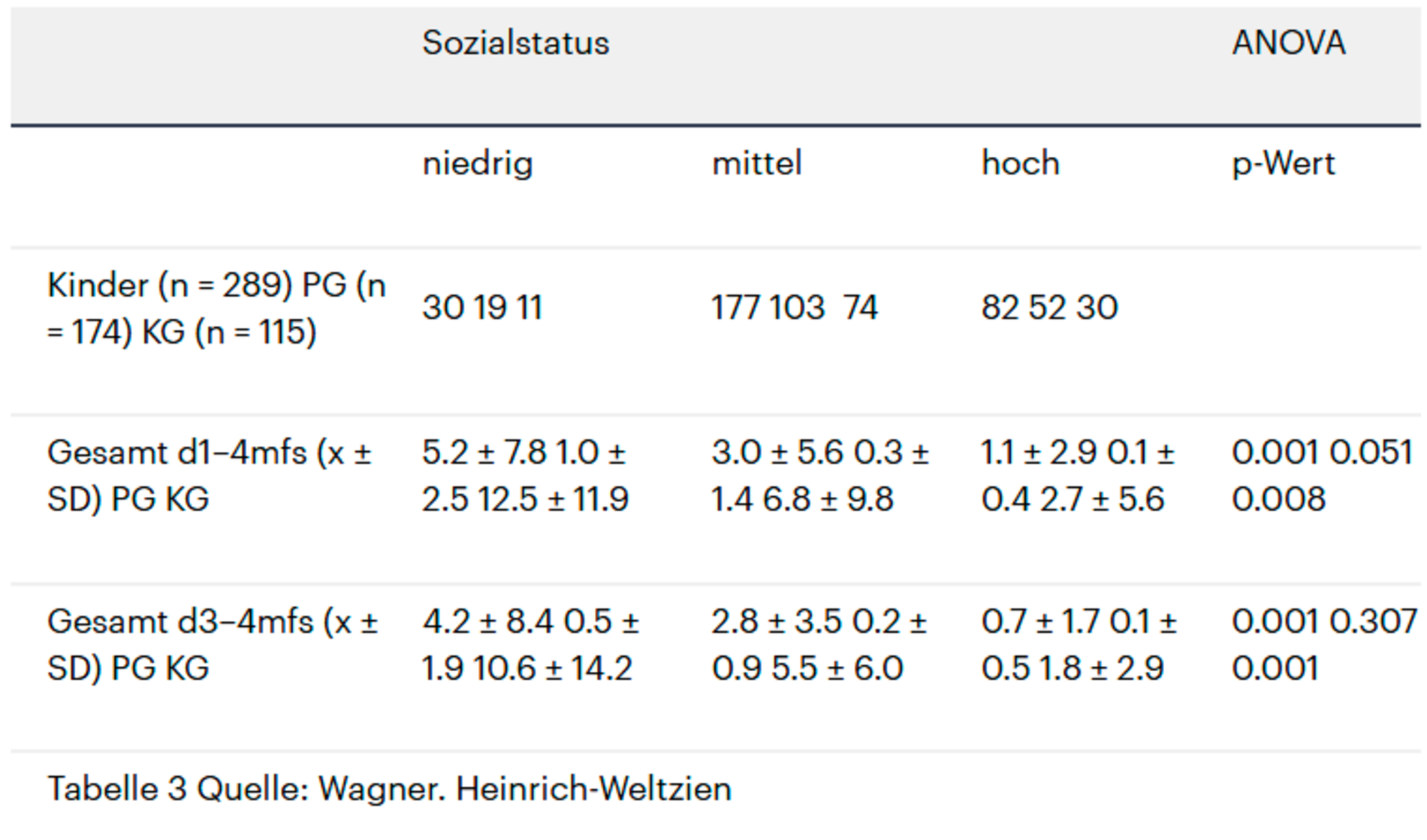 Dieser Präventionsansatz hat auch einen positiven Effekt auf die Mundgesundheit von Fünfjährigen mit niedrigem Sozialstatus. Ungleichheiten in der Mundgesundheit bei Kindern aus Familien mit geringem Bildungsniveau, niedrigem Sozialstatus, familiärem Kariesbefall, Migrationshintergrund oder von Alleinerziehenden wurden weltweit in zahlreichen Studien beobachtet [9, 10, 24, 42].